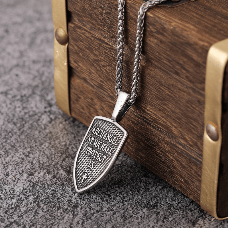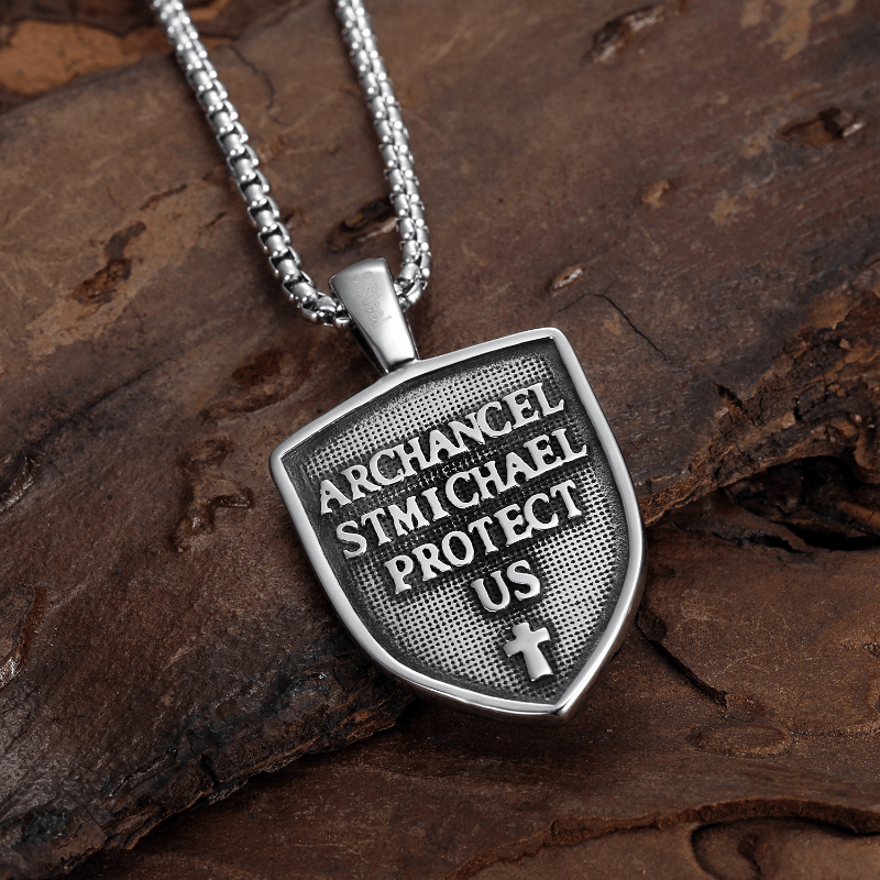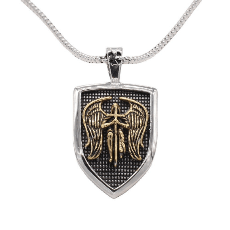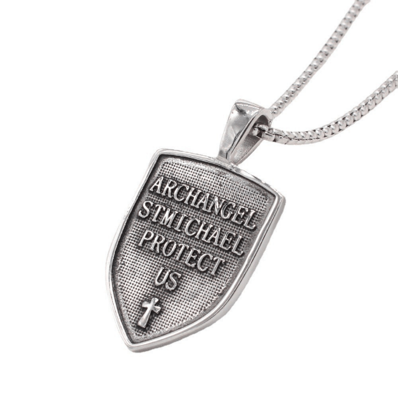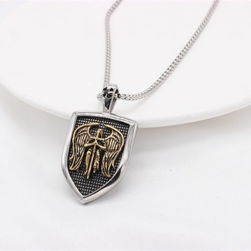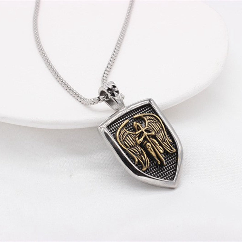 This men's punk necklace features a double-sided letter pendant with a vintage cross, angel, and shield design.