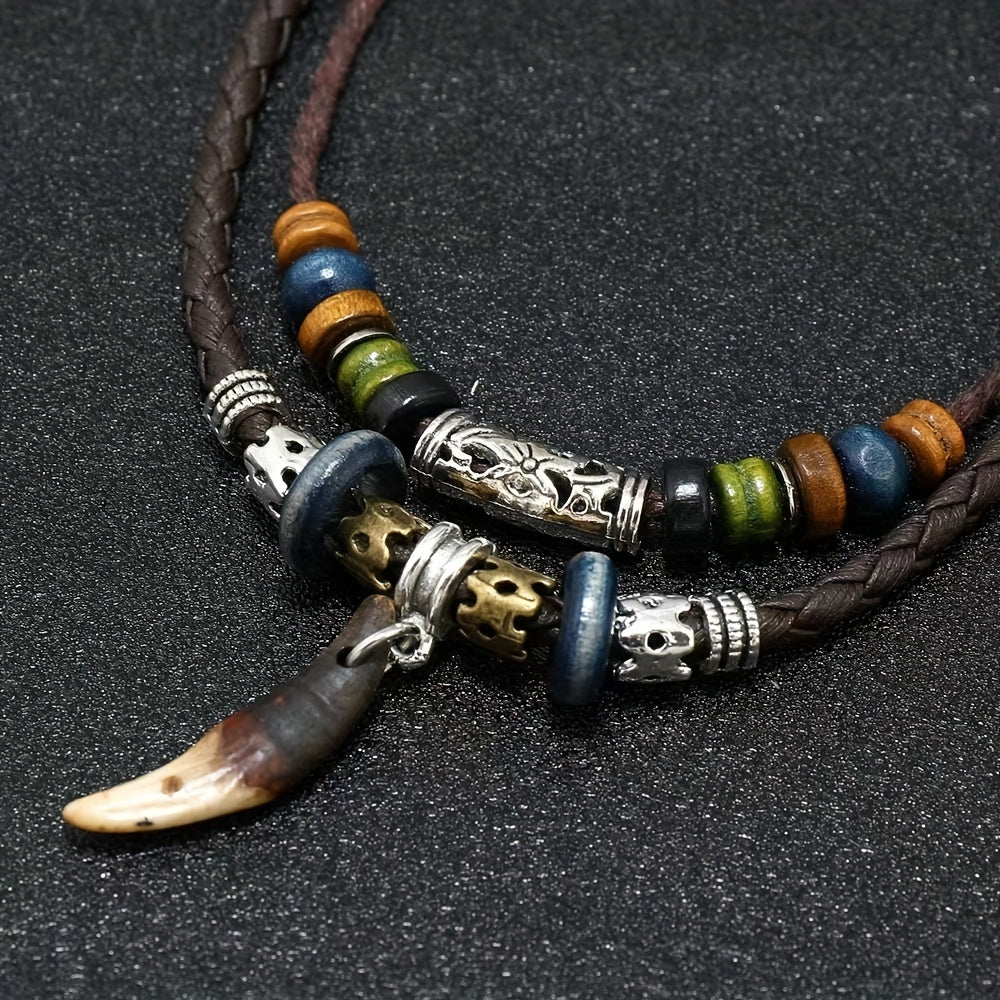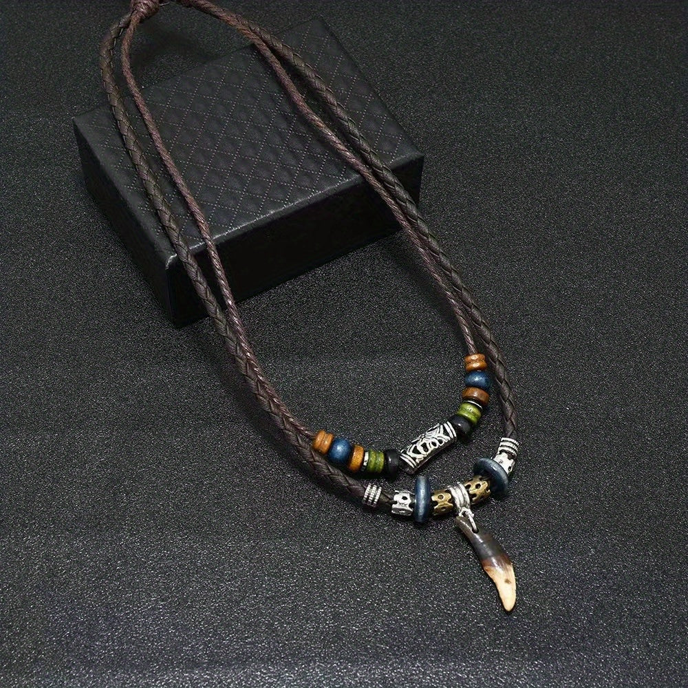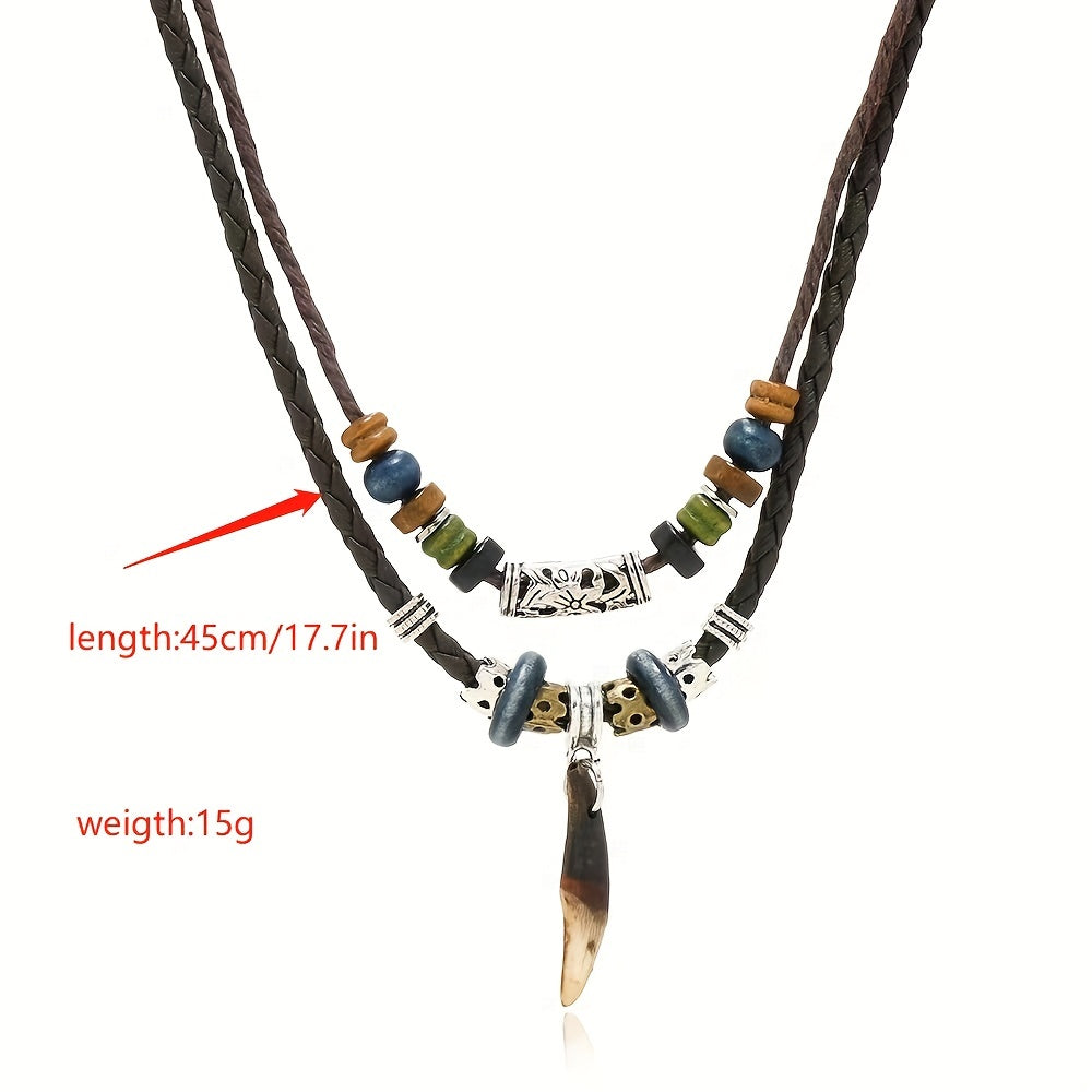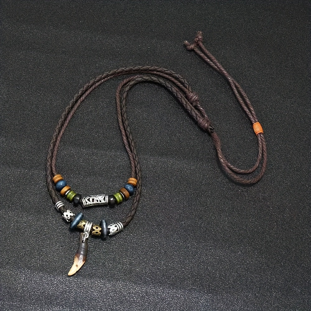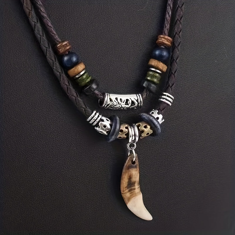 This Bohemian pendant necklace features a woven design with a cross pendant and tribal tooth beads. Perfect for men who appreciate vintage style jewelry.