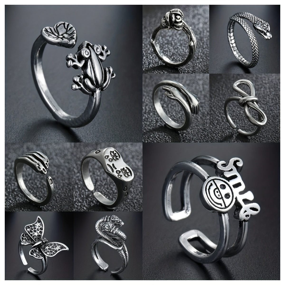 Add a touch of retro charm with this vintage-inspired flower, smile face, snake, butterfly, frog, and two hands hug ring. Perfect for a punk metal look or boho party jewelry.