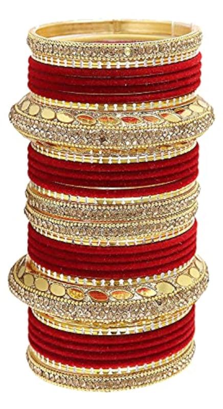 Elegant metal chuda set featuring zircon stone, pearls, and velvet work with latkan details. Perfect for traditional bridal wear.