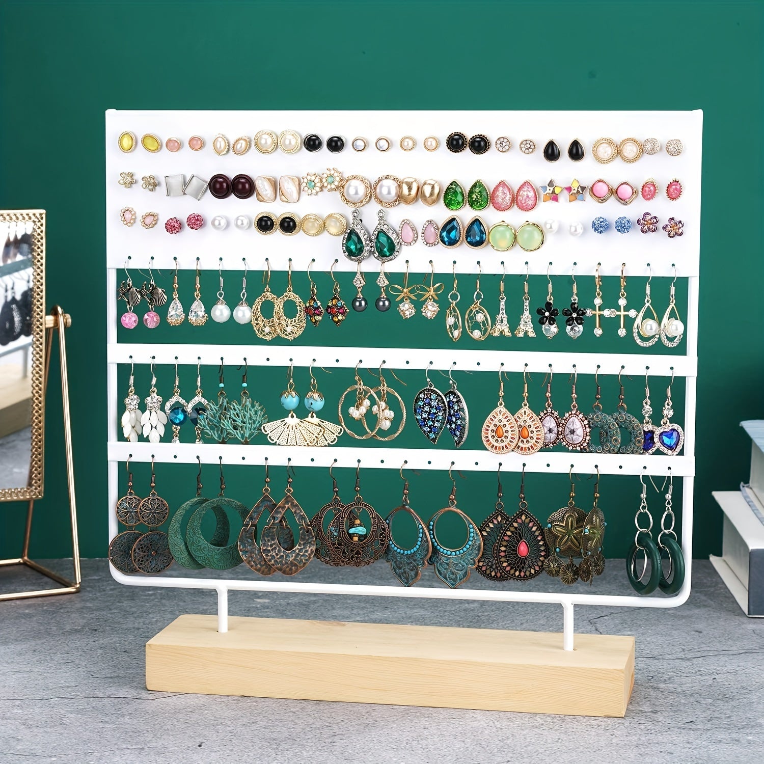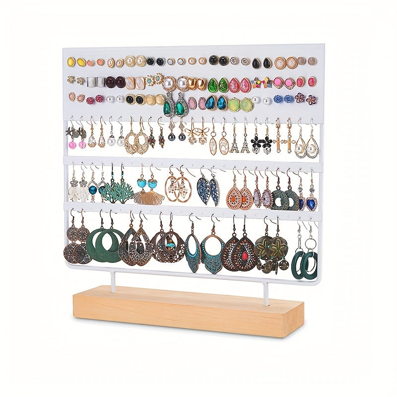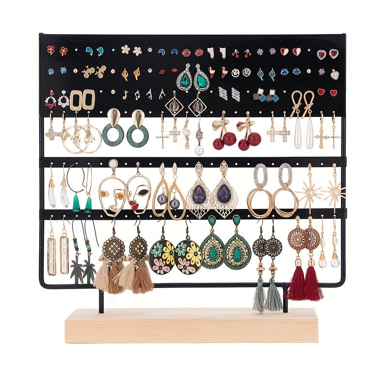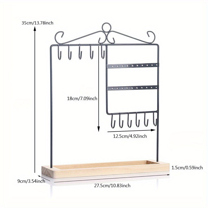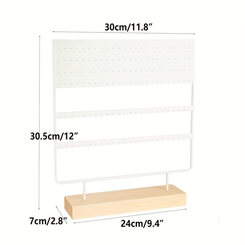Keep your earrings and piercings organized with this classic stand featuring a metal earring holder on a wood base tray. Ideal for showcasing and storing your jewelry collection.