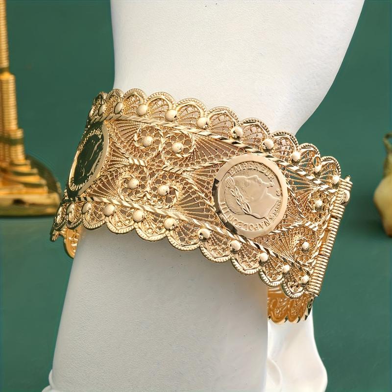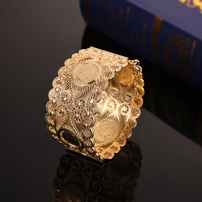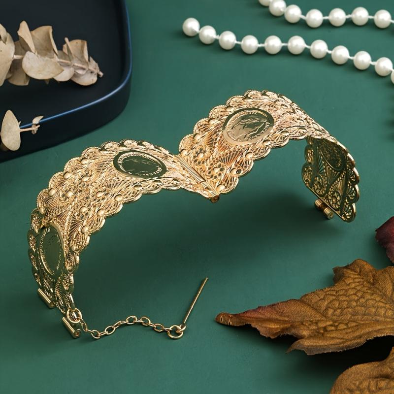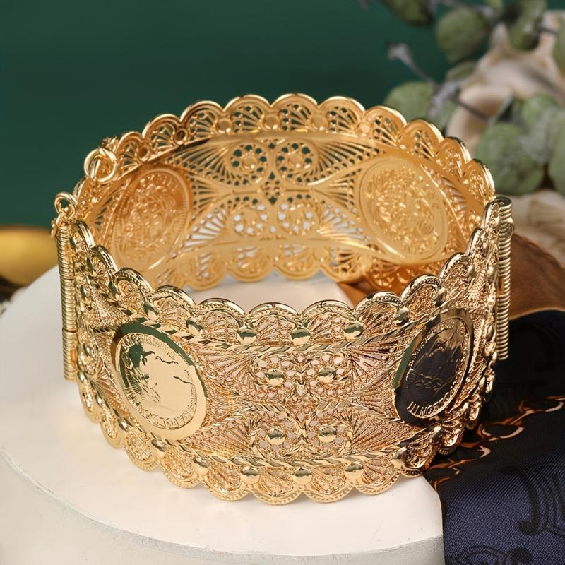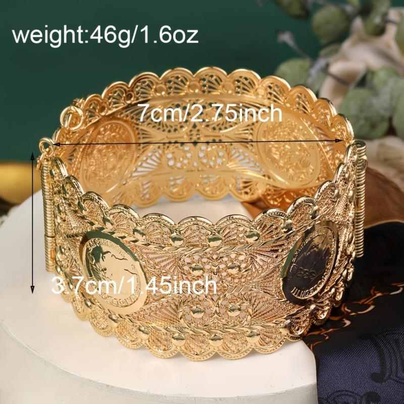Add a touch of elegance to your holiday or wedding attire with this stunning Middle Eastern style bracelet. Features hollow golden plated coins for a classic and timeless look.