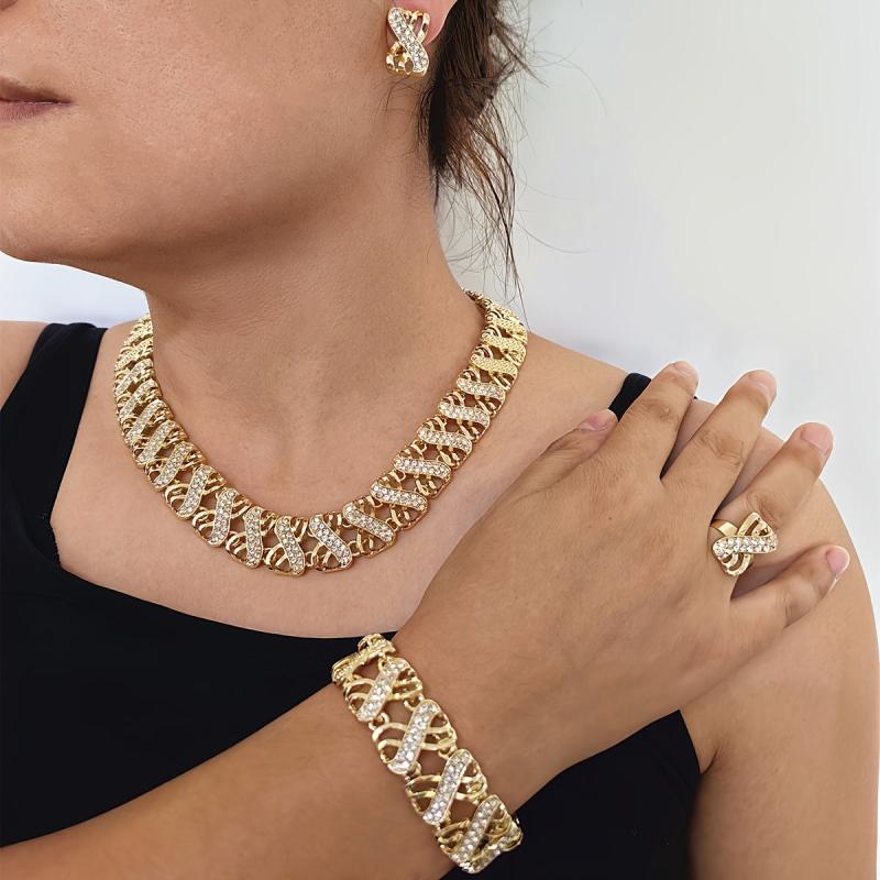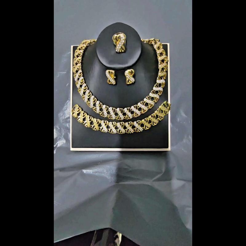 Elegant set of necklace, earrings, bracelet, and ring made of zinc alloy. Perfect for daily wear, gifting, parties, and music festivals.