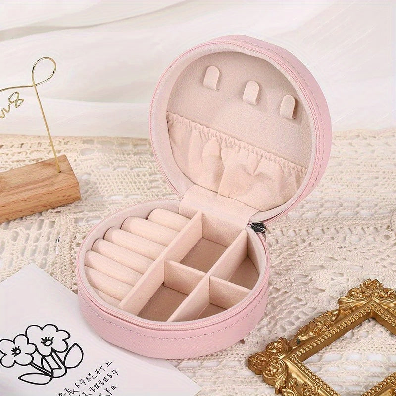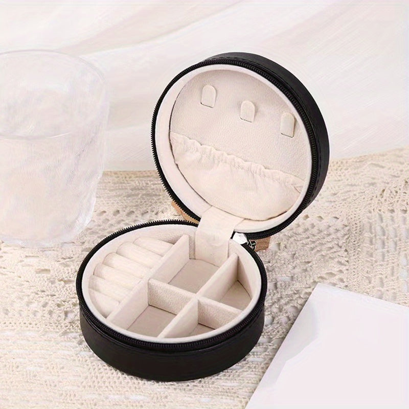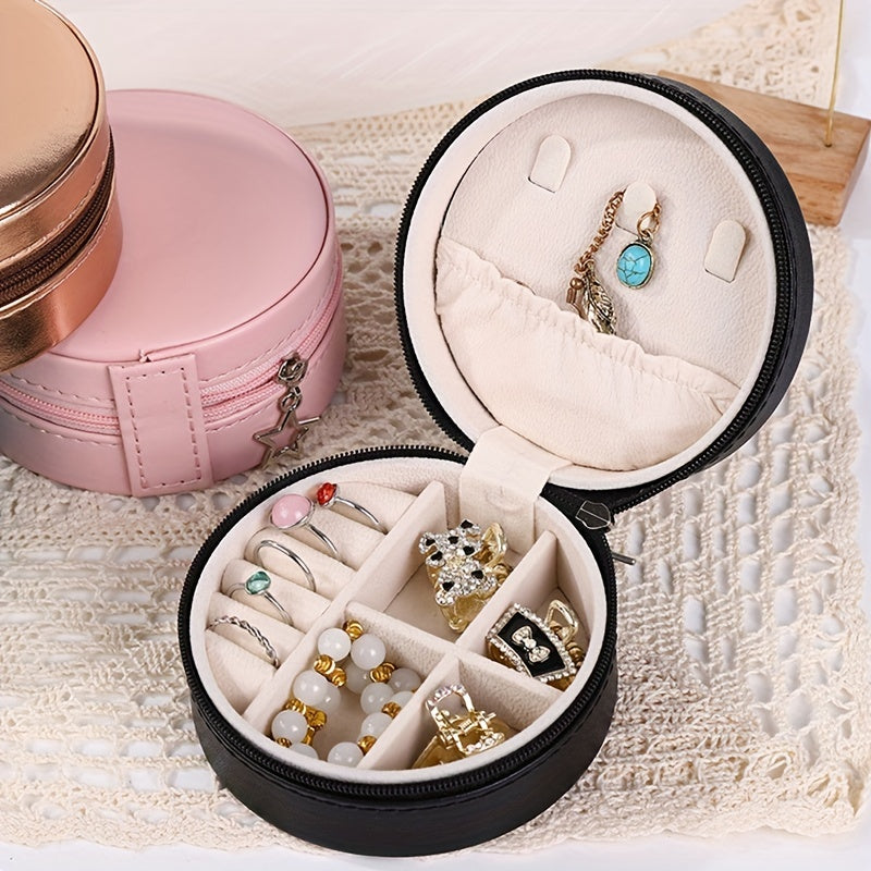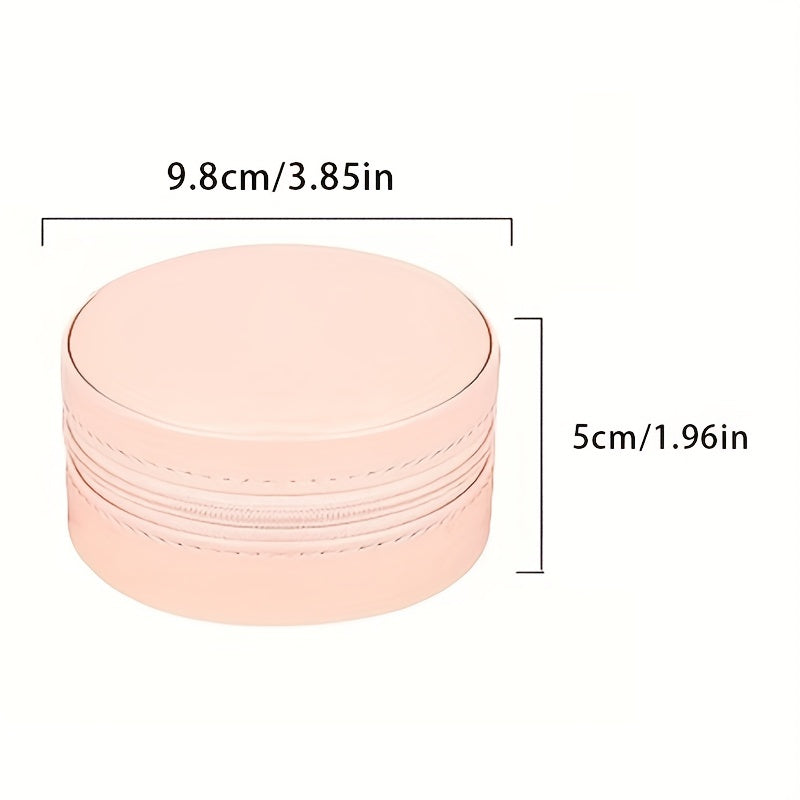 Keep your jewelry organized and secure with this round zipper storage box. Ideal for small items like rings, necklaces, and studs.