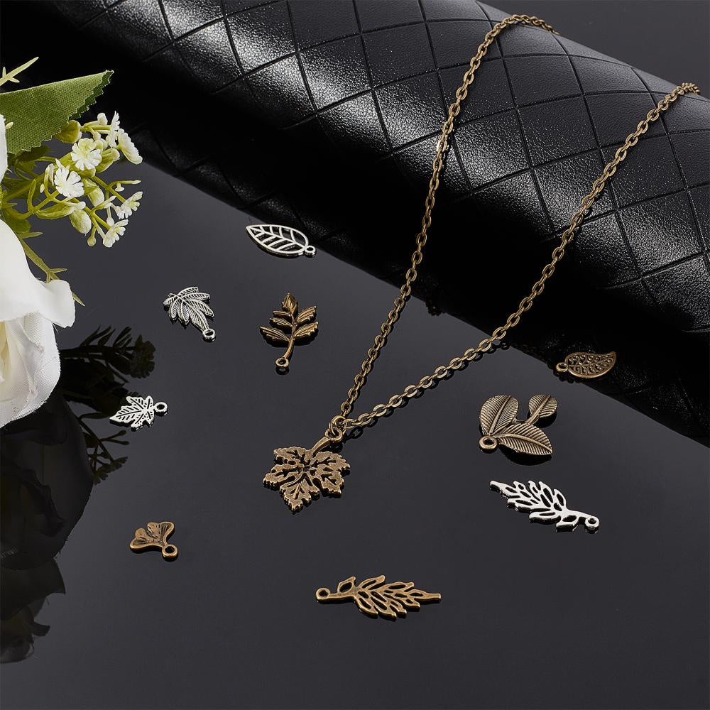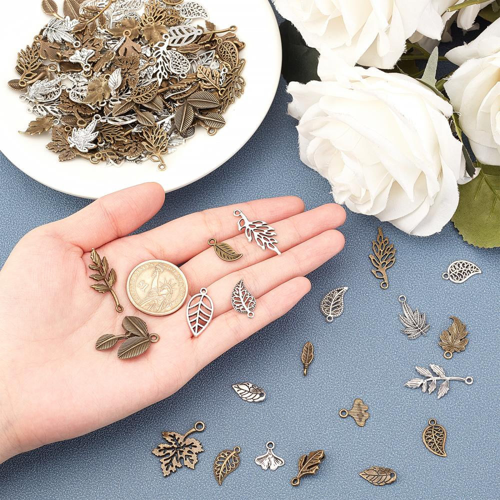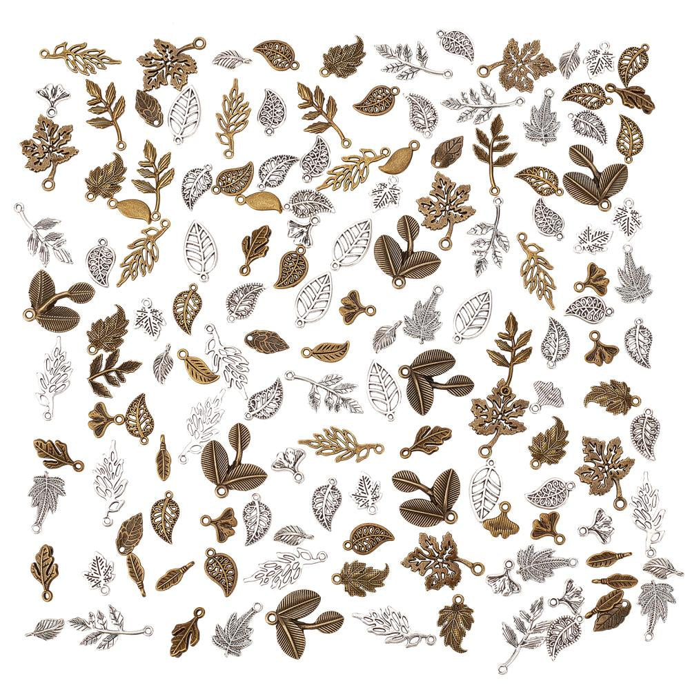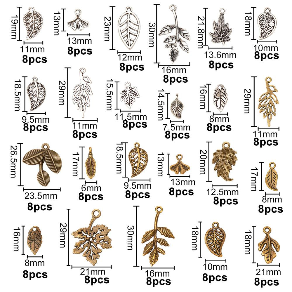 This assortment includes 184 pieces of leaf pendants in antique silver or bronze finish. Each pendant measures 19x11x2mm with a hole size of 1.5mm. Made from cadmium and lead-free materials, this set weighs about 1000g and contains approximately 1110 pieces.