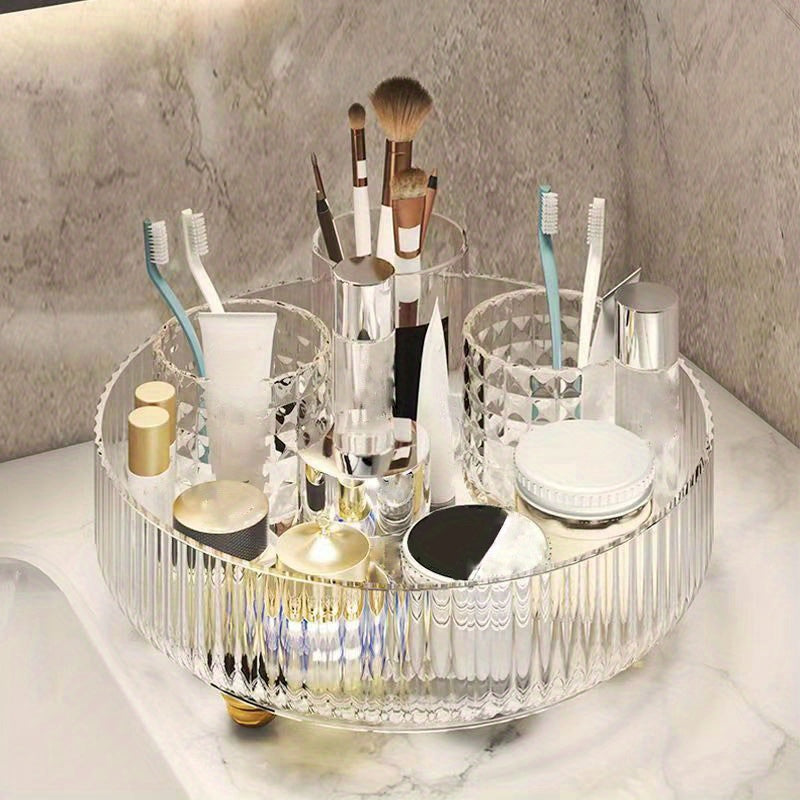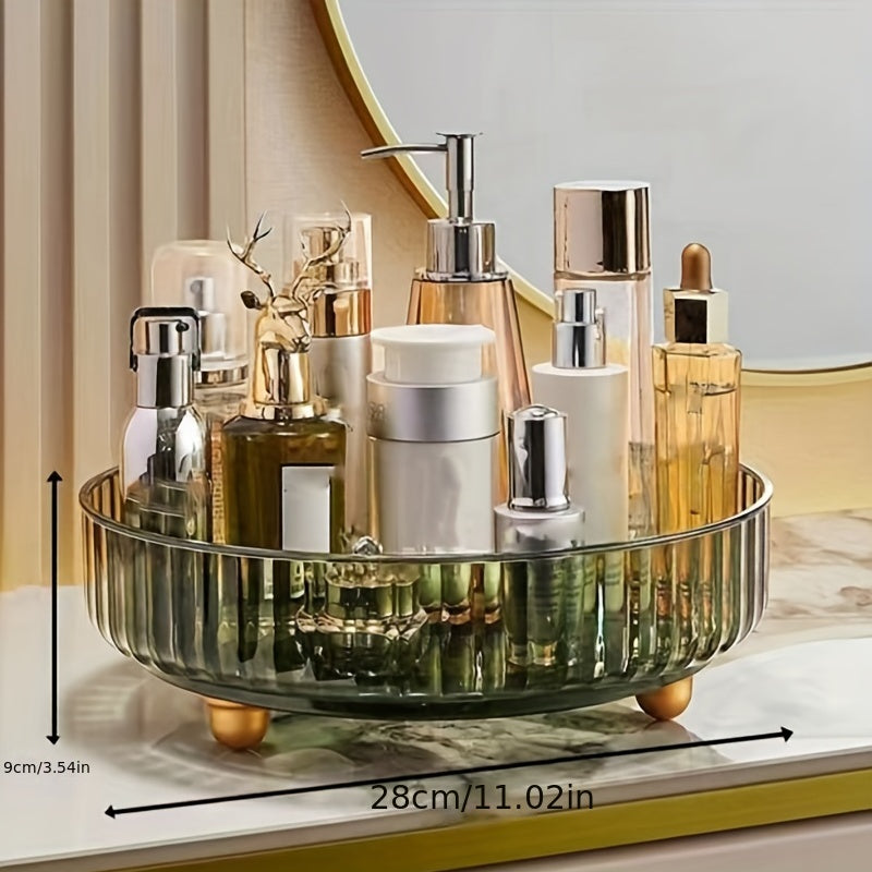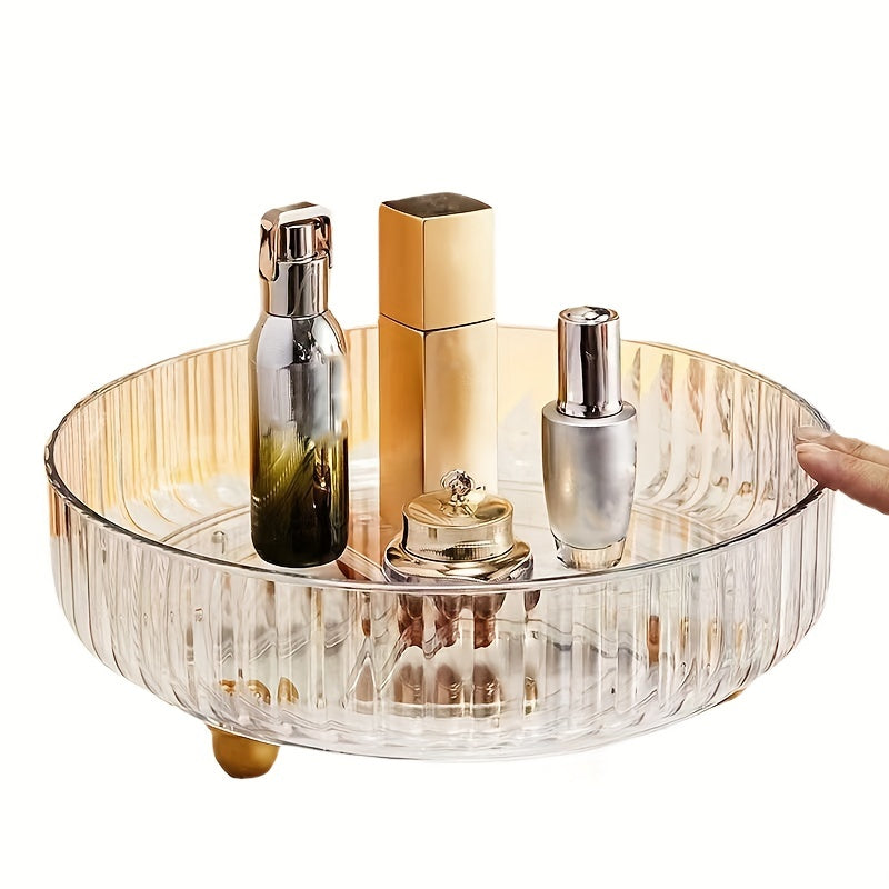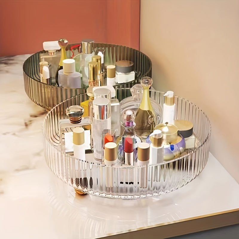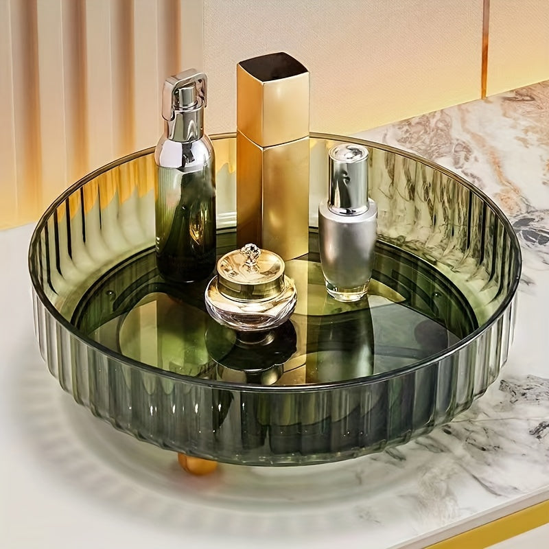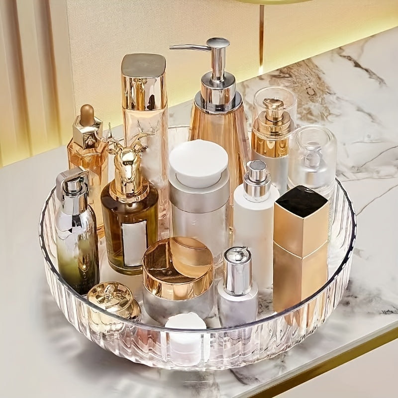 This clear storage rack features a lazy susan design, making it easy to access your bathroom essentials. The double handles provide convenience for moving the rack around.