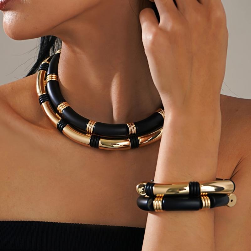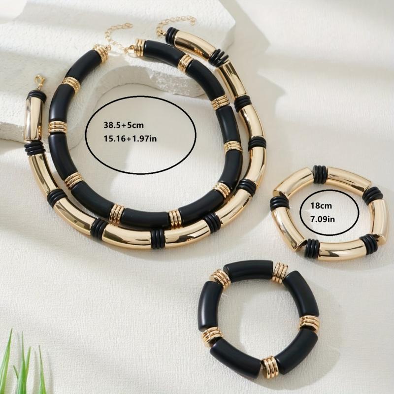 Elevate your style with this fashionable two-piece women's jewelry set that includes a unique curved cylindrical necklace and bracelet paired with flat round bead accessories. Stand out with this modern and chic set.