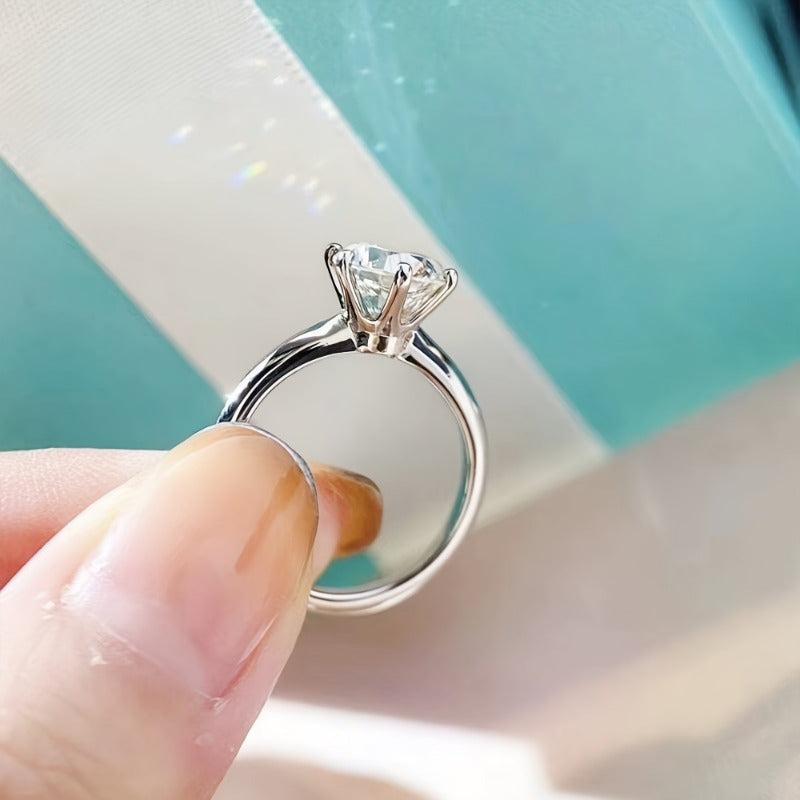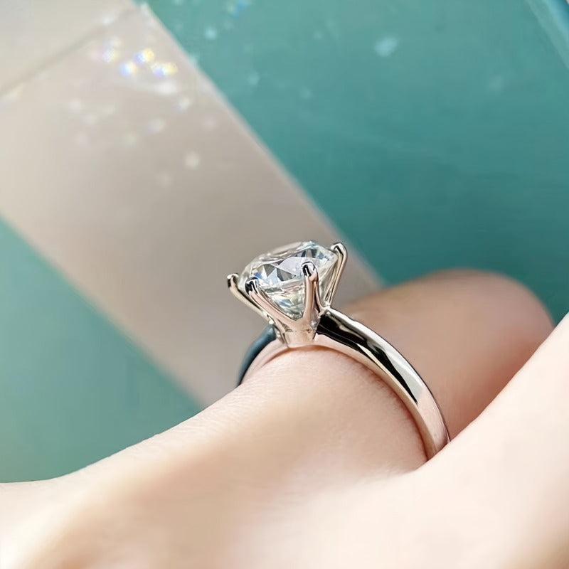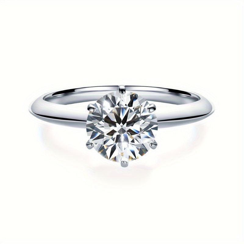 This stunning engagement ring features a lab-created moissanite stone set in a 6 prong setting. Made from 925 silver with an 18K golden plating, this ring is hypoallergenic and available in various carat sizes.