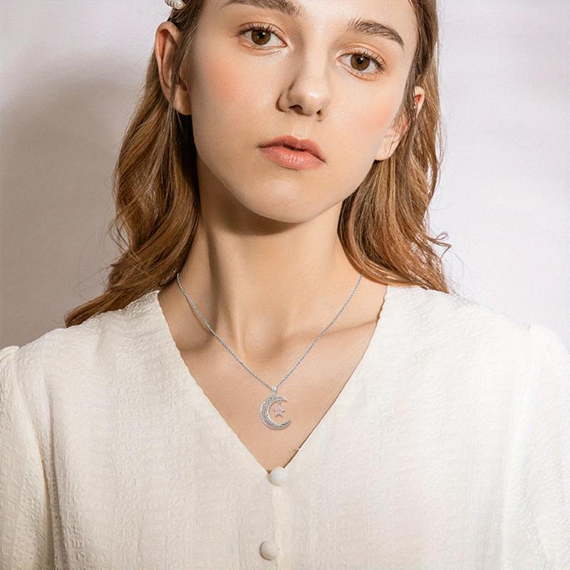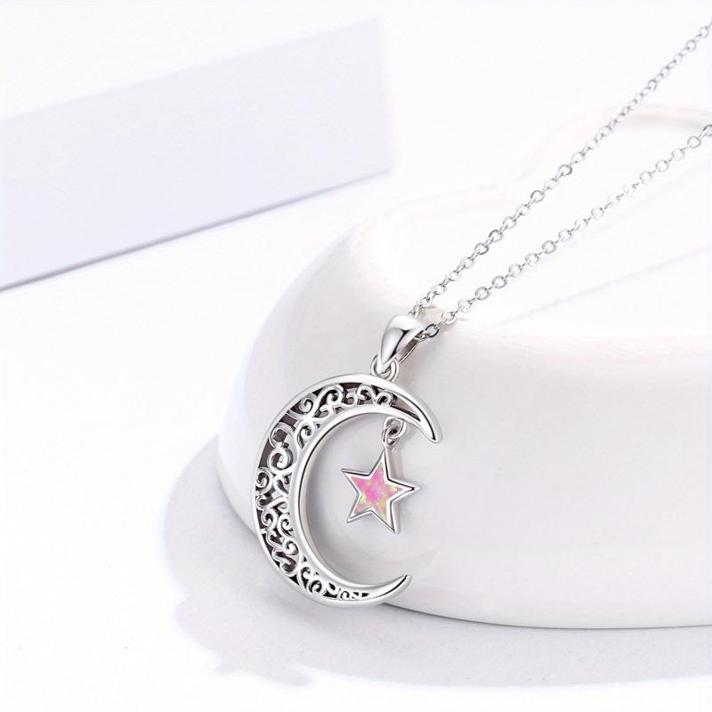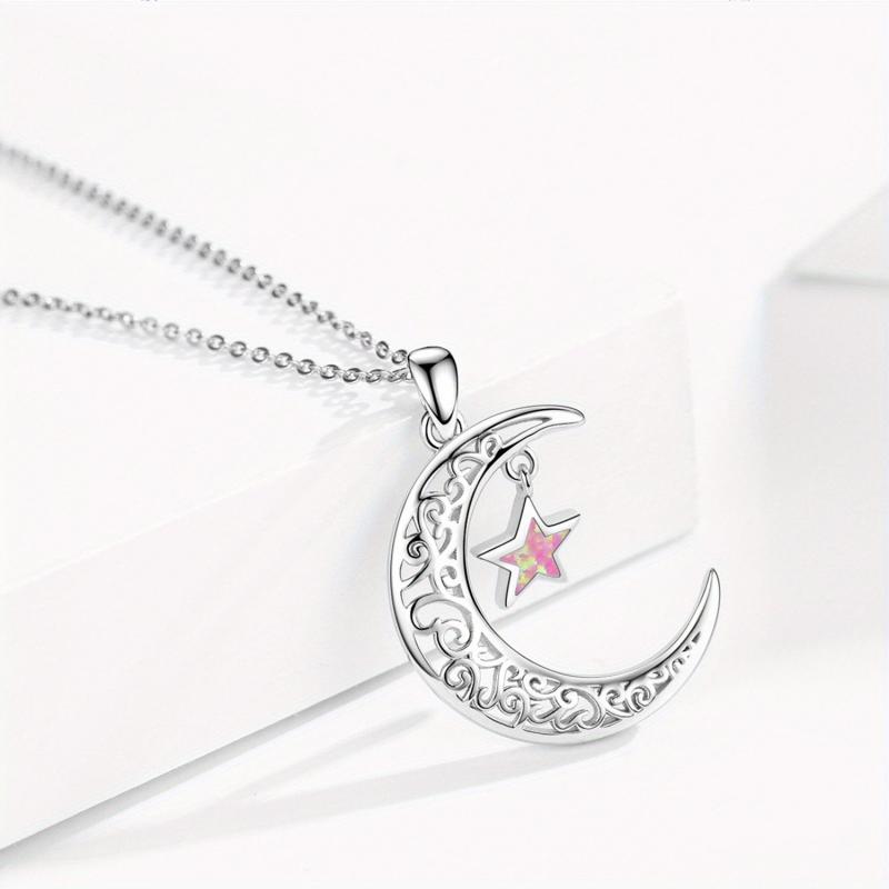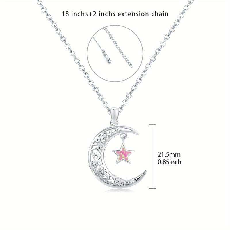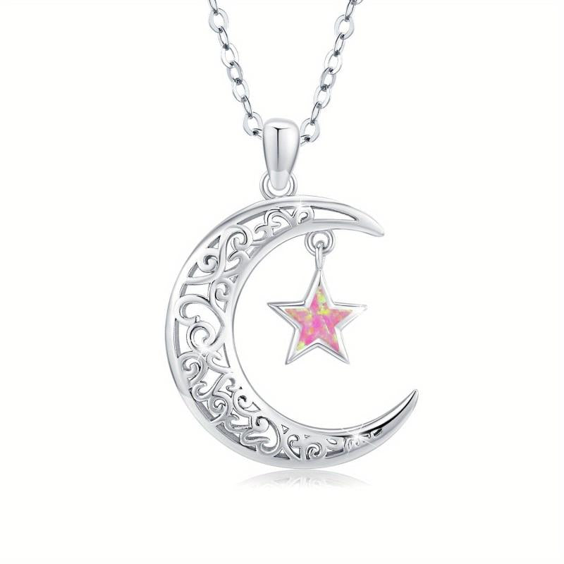 Moon Star Necklace 925 Sterling Silver Crescent Moon Star Pendant with Pink Opal