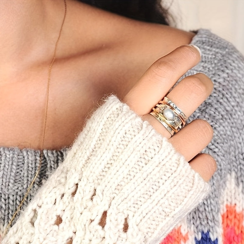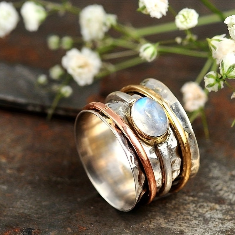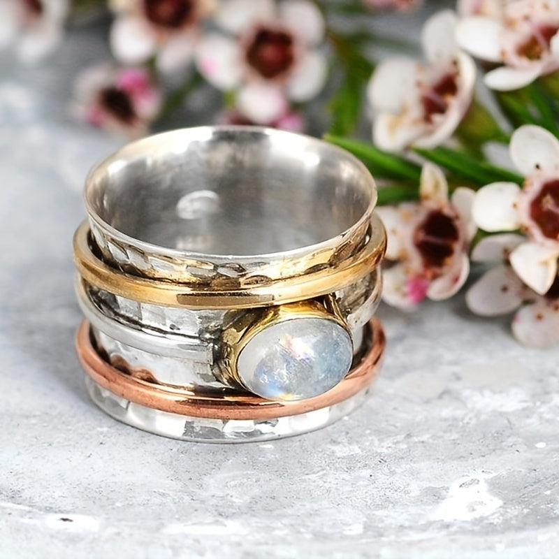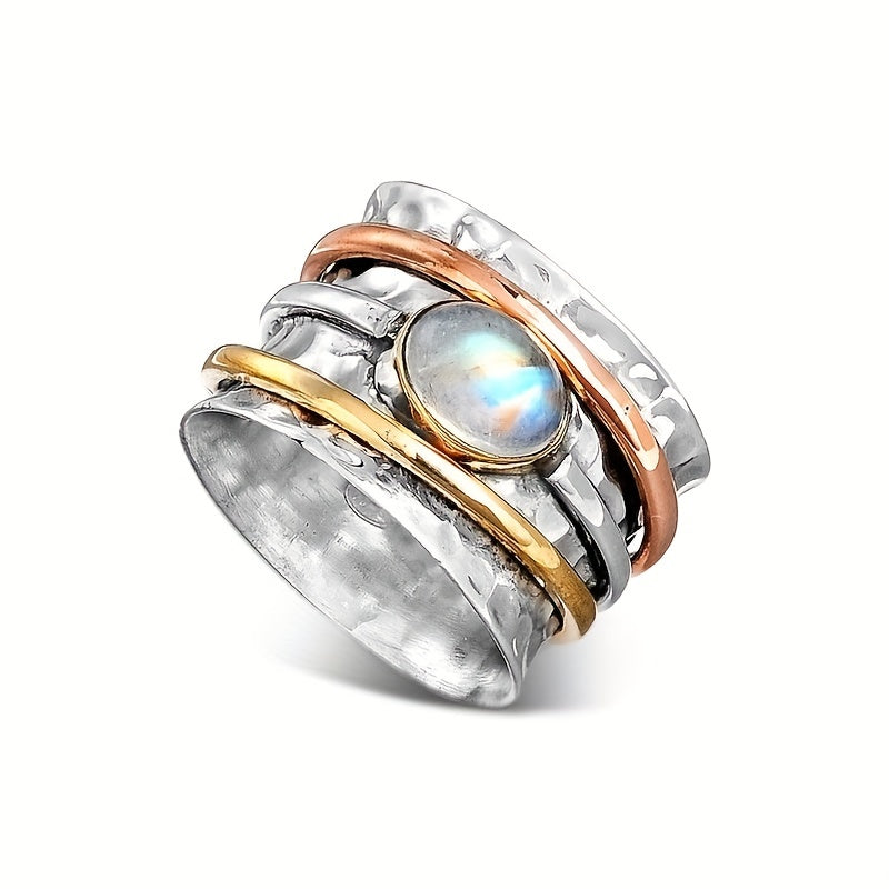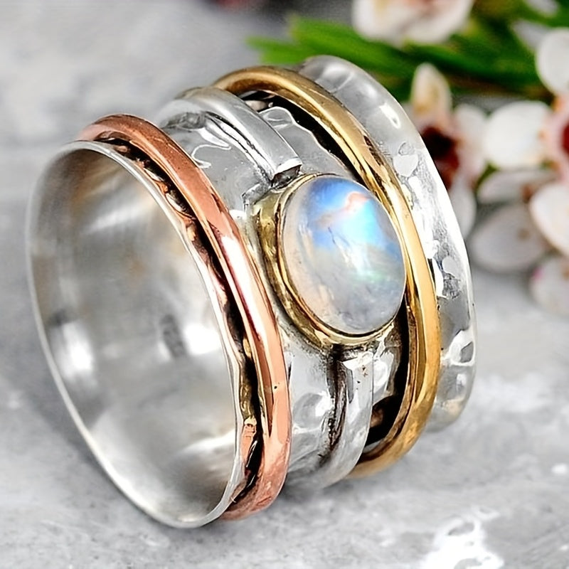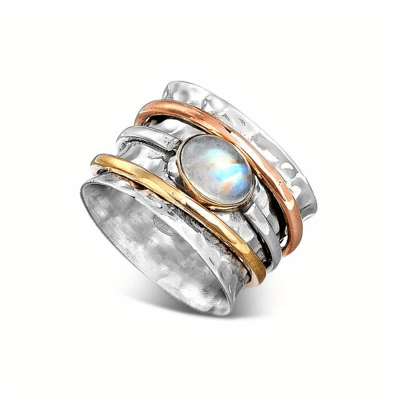 This unique ring features a round moon stone set in metal with three wide spinner rings. Perfect for engagement, party, or wedding occasions.