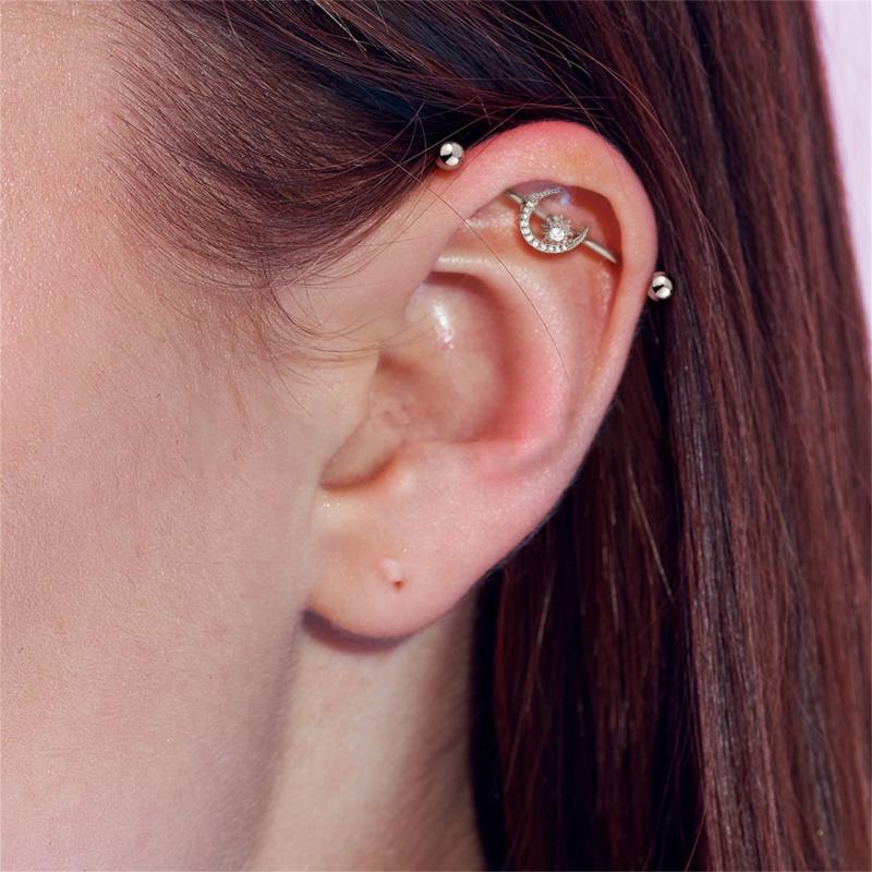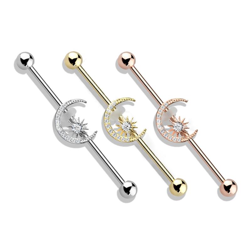 Elevate your style with these fashionable industrial barbell ear studs featuring moon and sun synthetic stone design. Perfect for daily wear.
