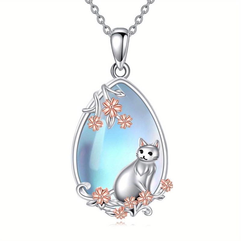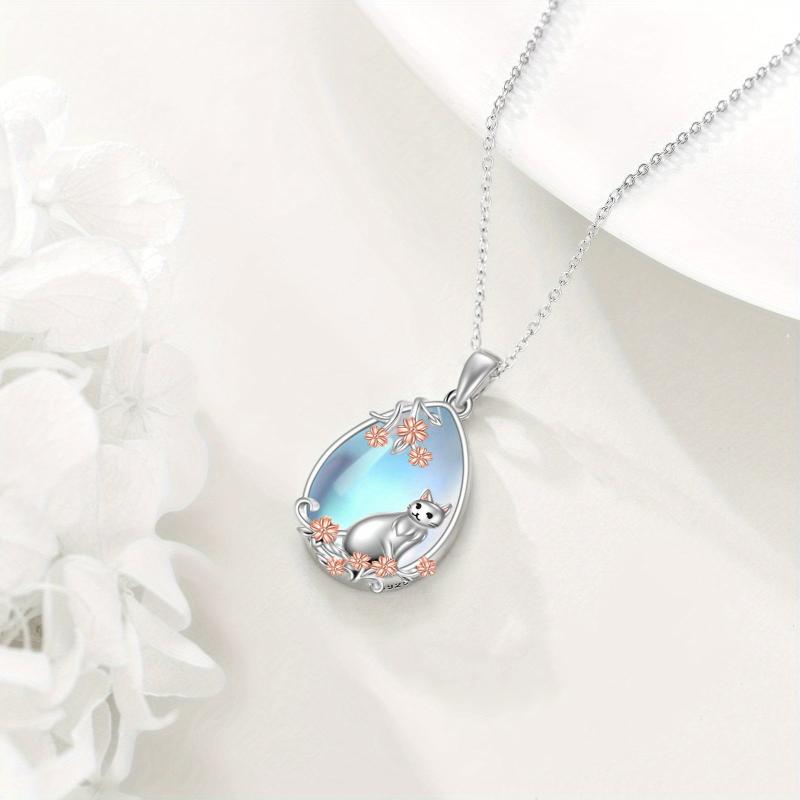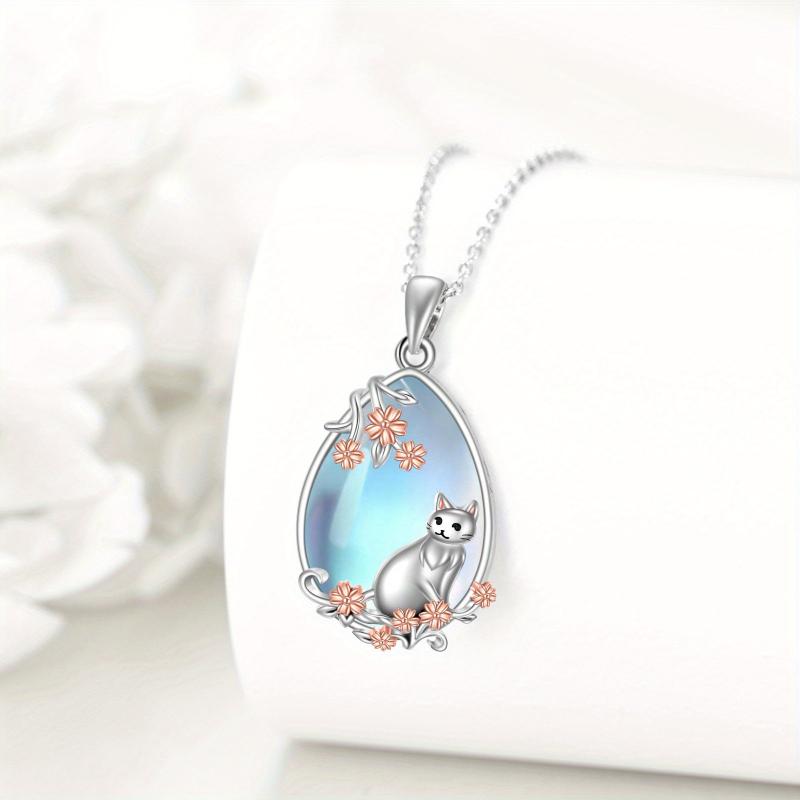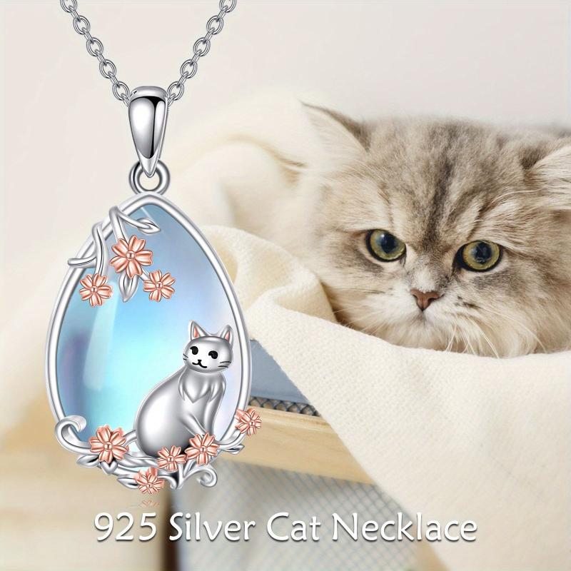 Elegant silver necklace with a moonstone cat pendant, perfect for cat lovers.