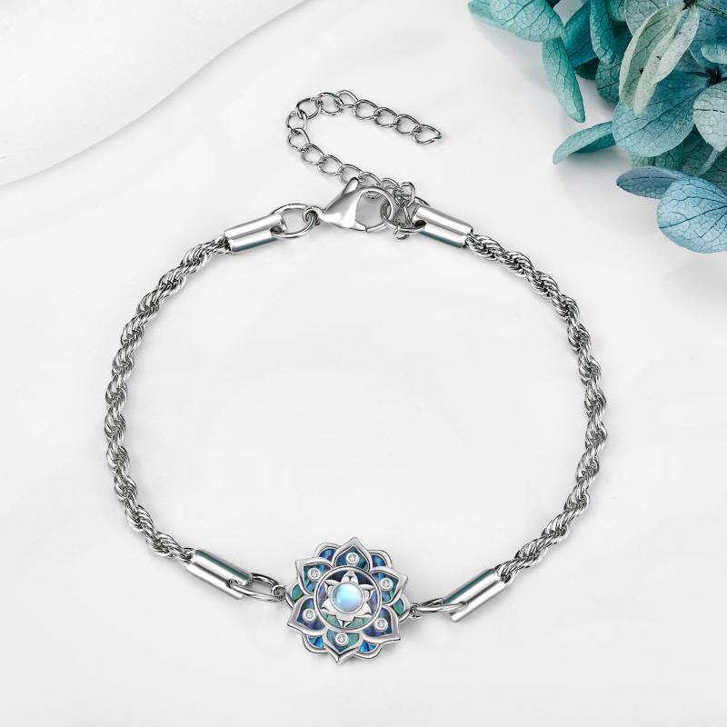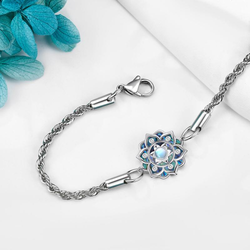 This stunning bracelet features synthetic moonstone beads and a lotus flower charm made of sterling silver with abalone shell accents. Perfect for yoga enthusiasts or anyone who loves unique and spiritual jewelry.