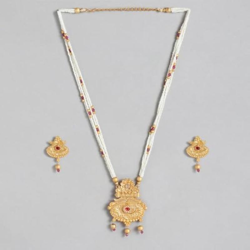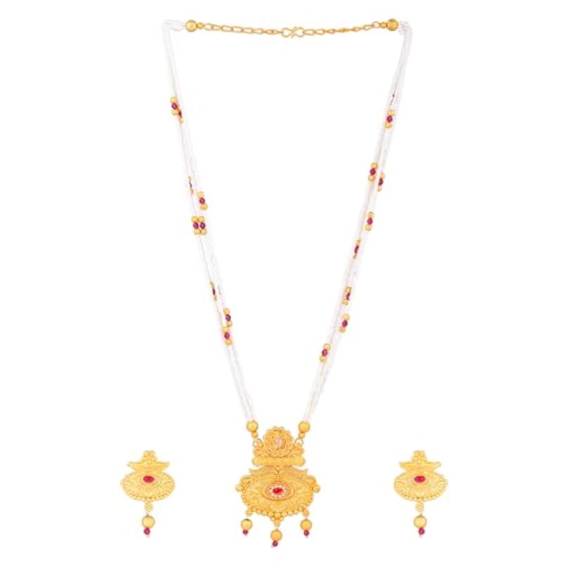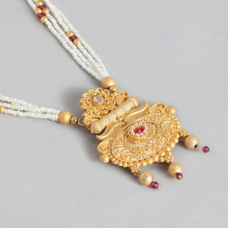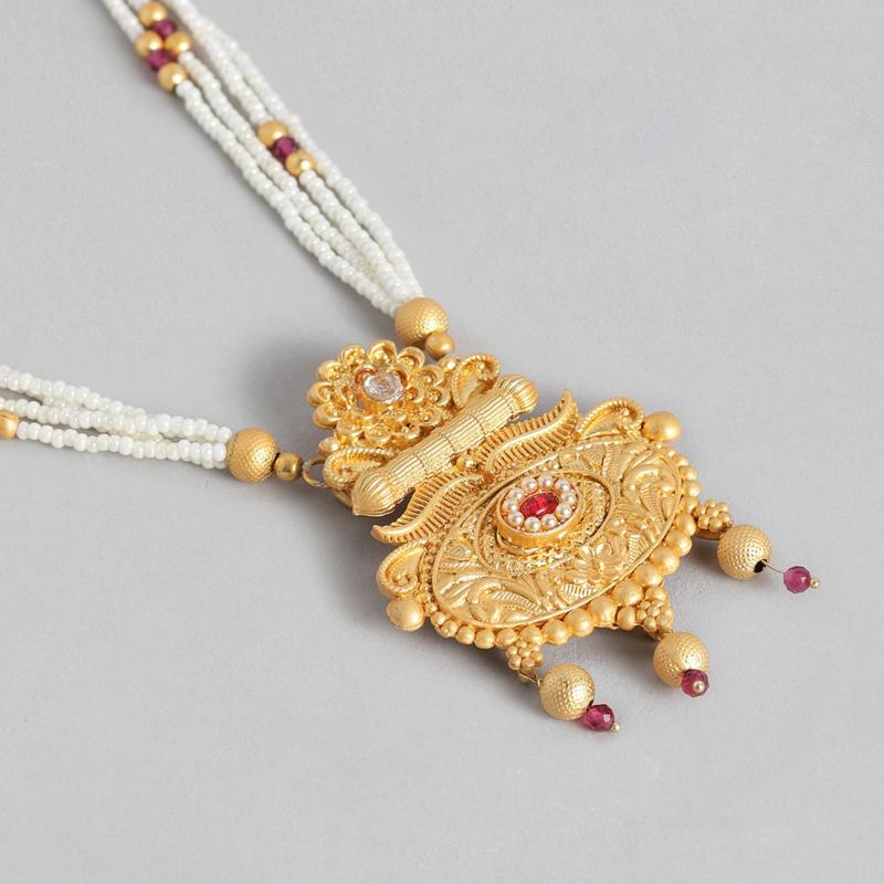 Elegant plated necklace featuring traditional pearls and ruby studded crystals.