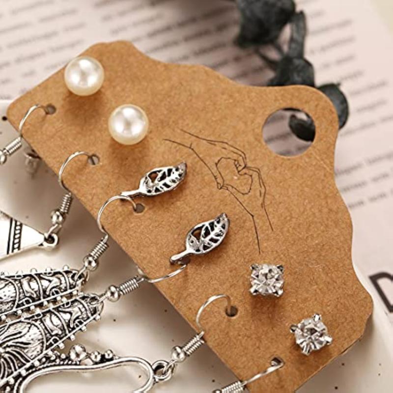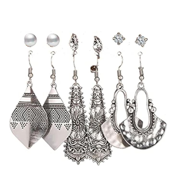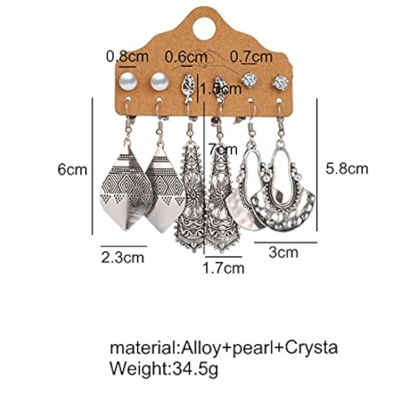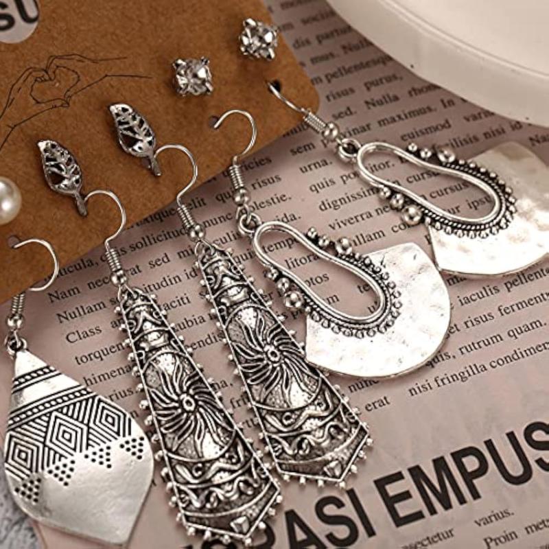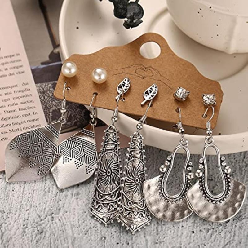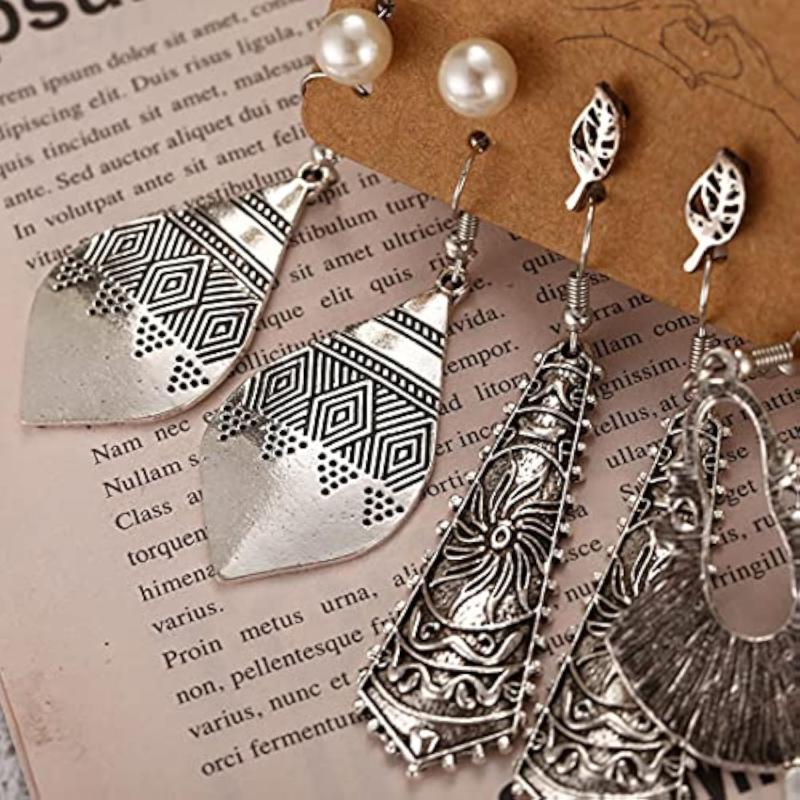 Get this stunning set of 6 pairs of earrings featuring mysterious pearls and AD stones. Made with oxidised German silver plating, these earrings are perfect for adding a touch of elegance to your outfit.