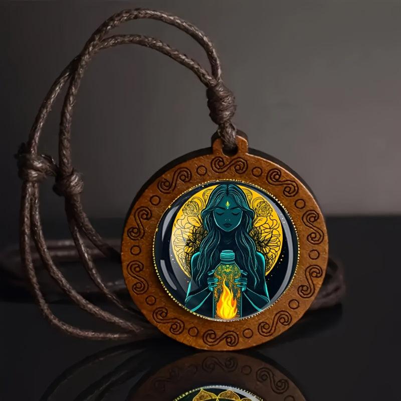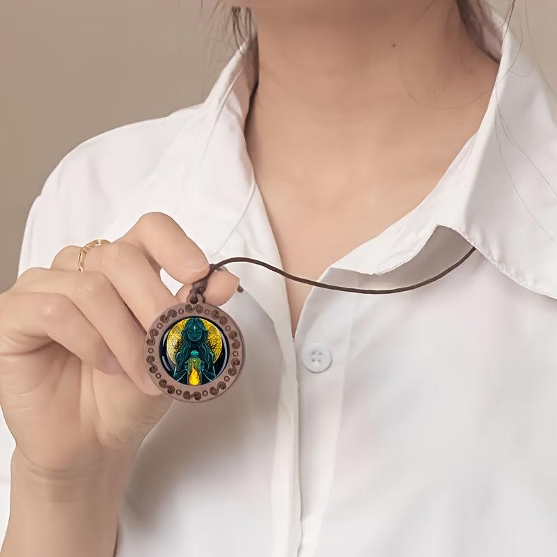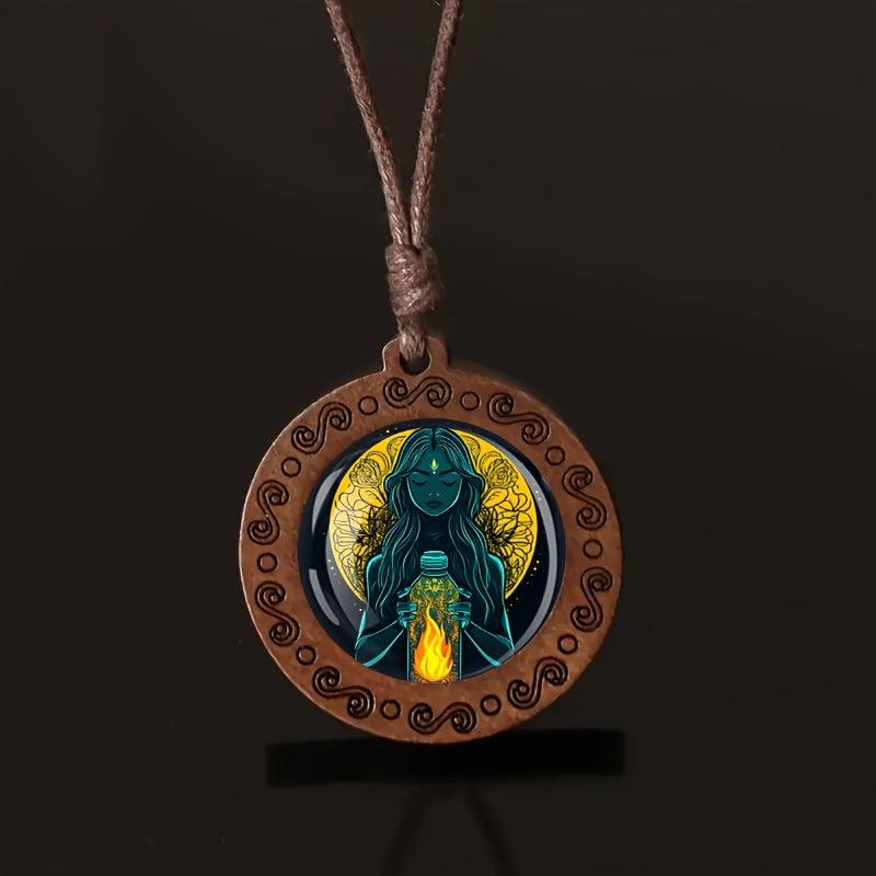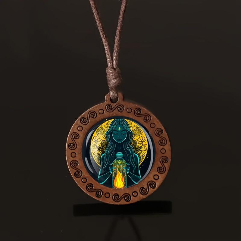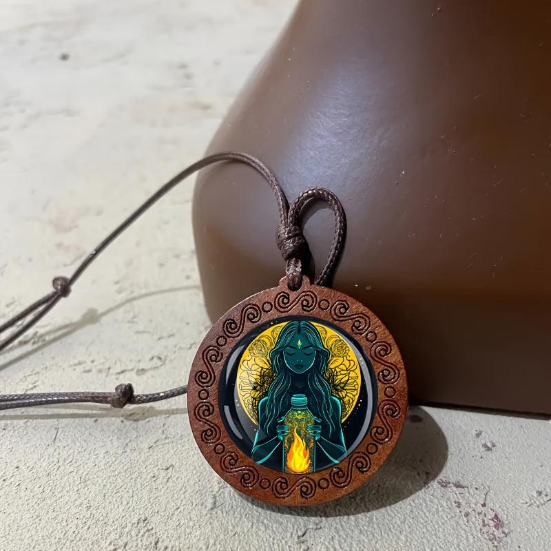 Exude bohemian vibes with this mystical bottle woman glass art wooden pendant necklace. Adjustable for daily wear and holiday looks. Crafted from natural wood and glass to add a retro touch to your outfit.