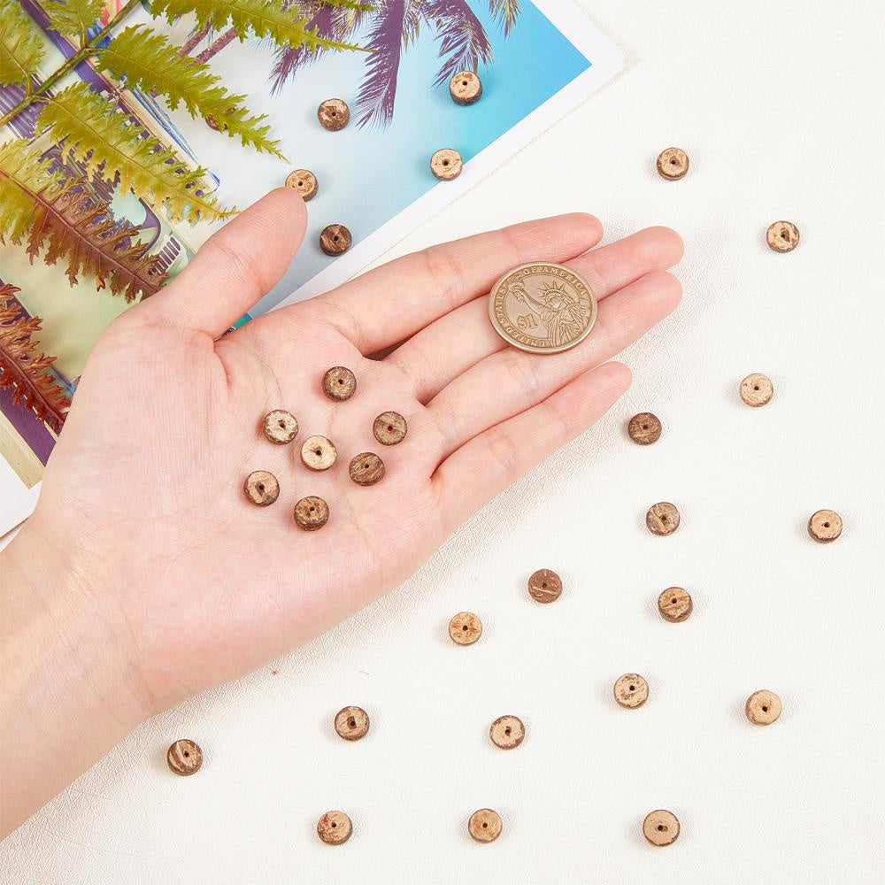 Create unique jewelry pieces with this set of 428 natural coconut shell rondelle beads. Perfect for earring, bracelet, and necklace making. These beads add an earthy and natural touch to your DIY crafts.