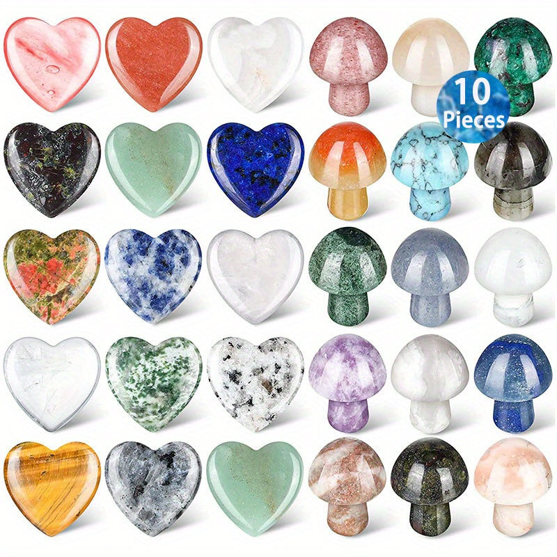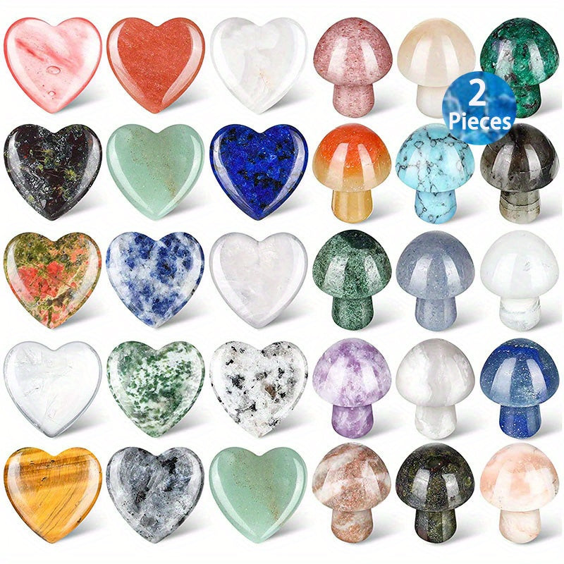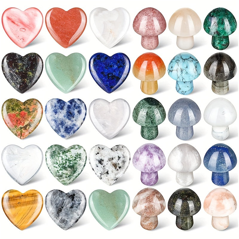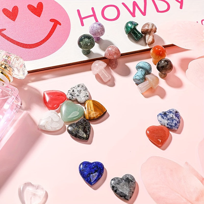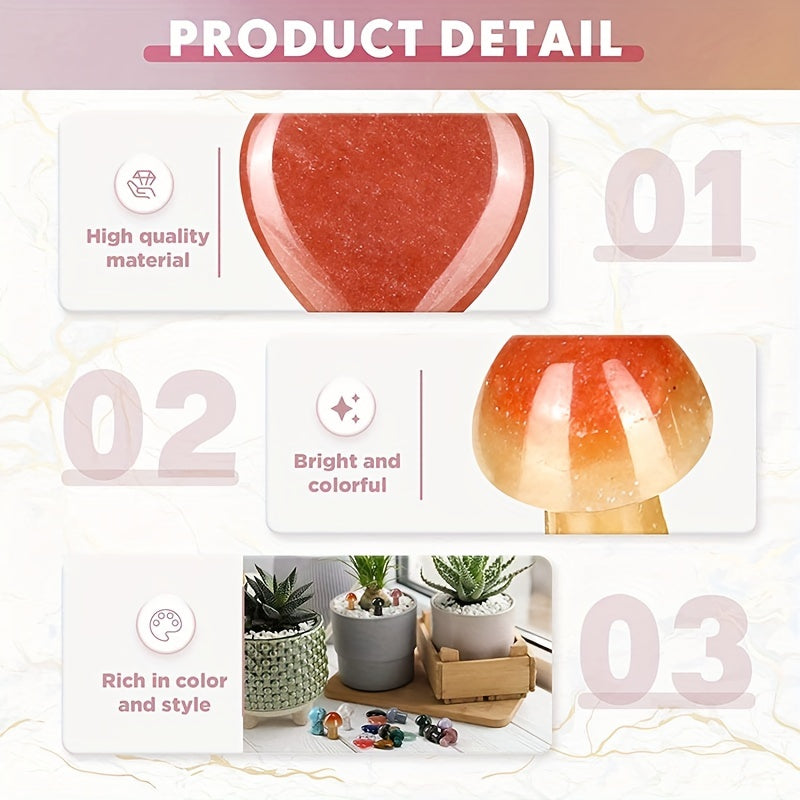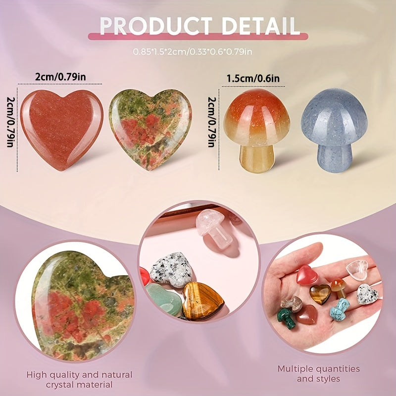 Enhance your space with this pack of natural crystal mushrooms in heart shapes. Perfect for flower pots, fish tanks, yoga spaces, or energy gem collections.