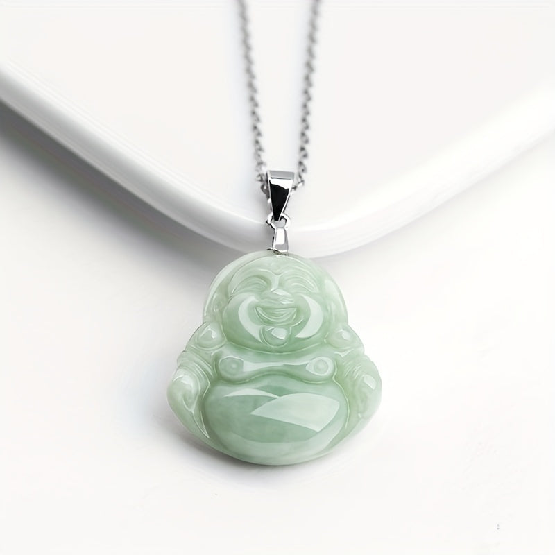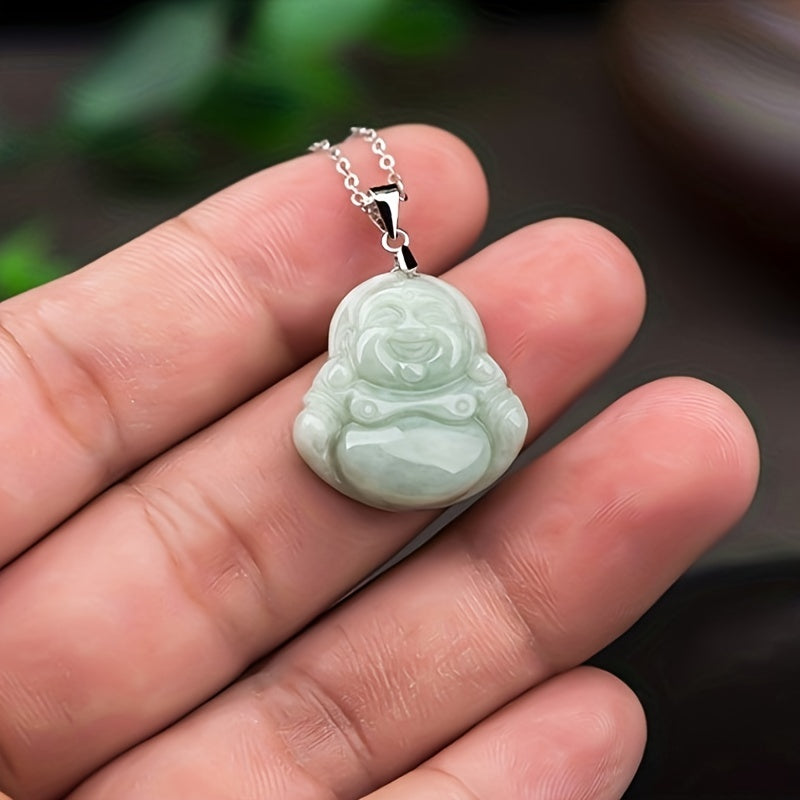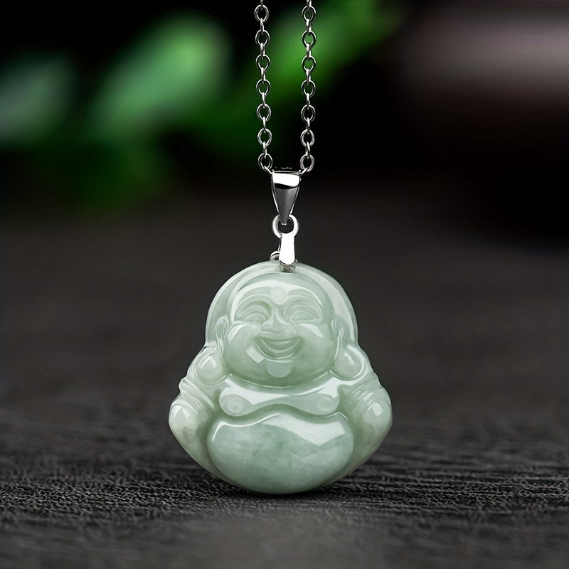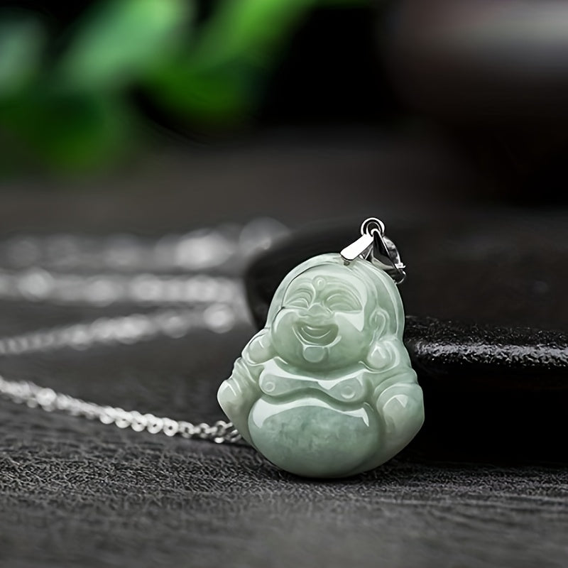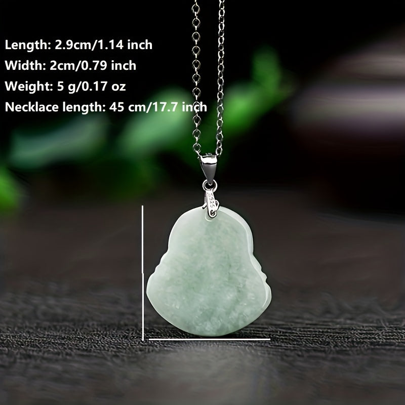 This exquisite pendant features a light green Buddha man crafted from natural Myanmar jade and set in 925 silver. A perfect accessory for women.
