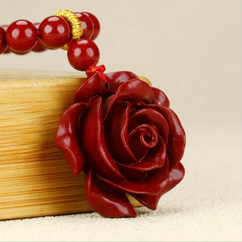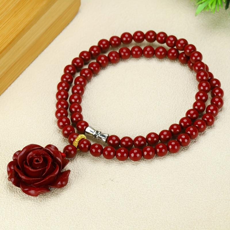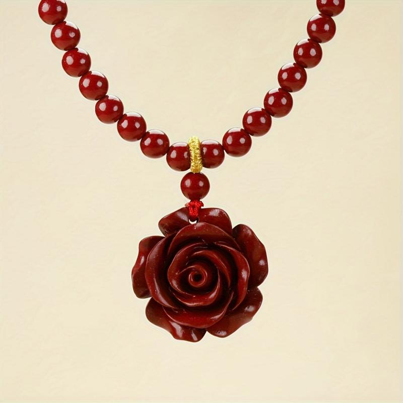 This lovely necklace features a high content purple golden sand pendant with a cinnabar rose design. It is sweet and perfect for a female wearer.