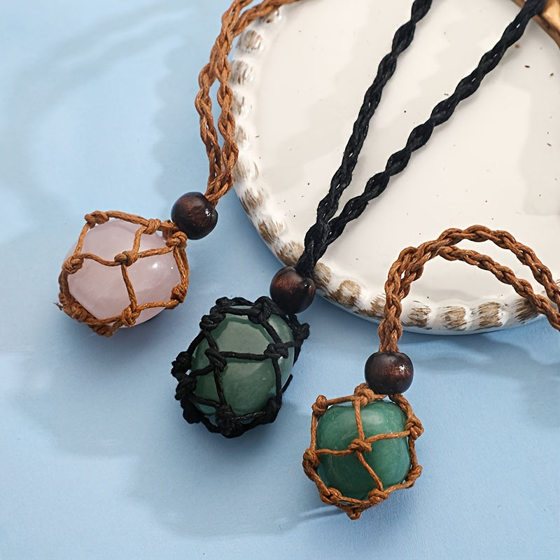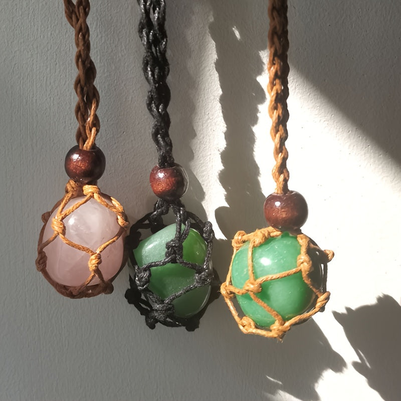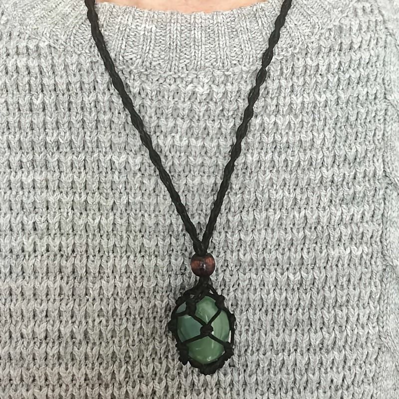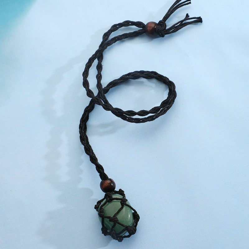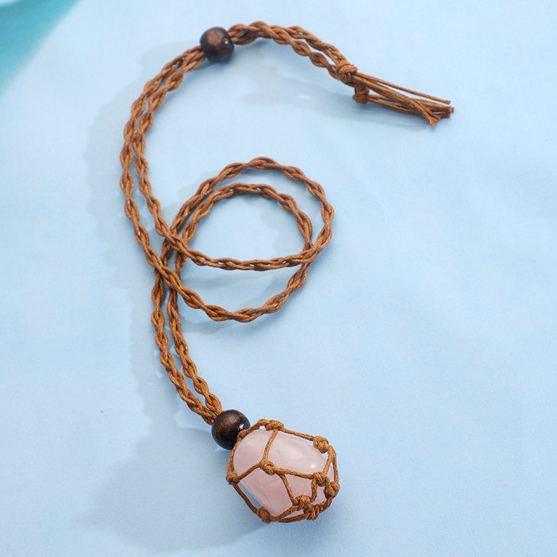 This hand-woven necklace features a raw natural stone crystal pendant in a mesh pocket design. It is adjustable and perfect for crystal healing.