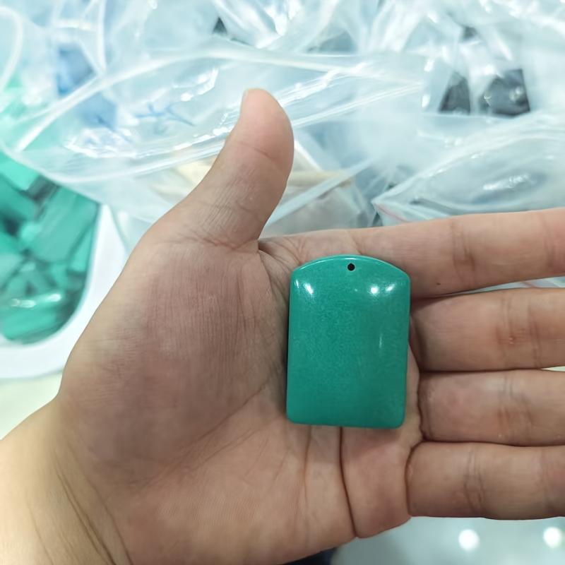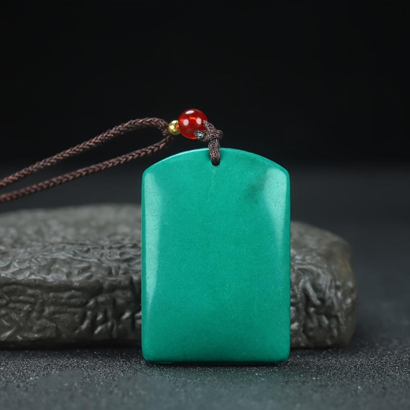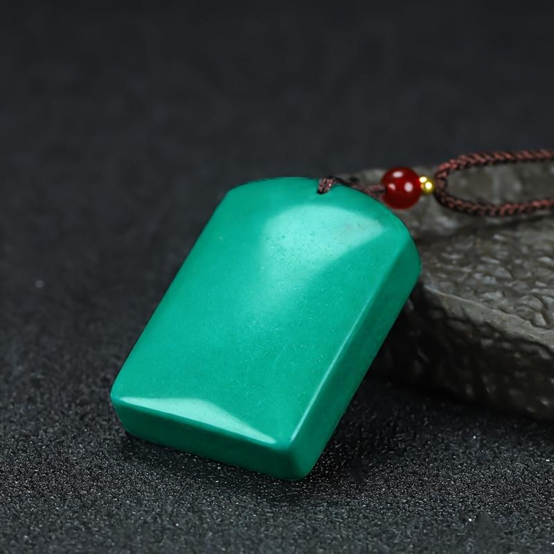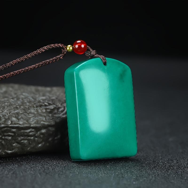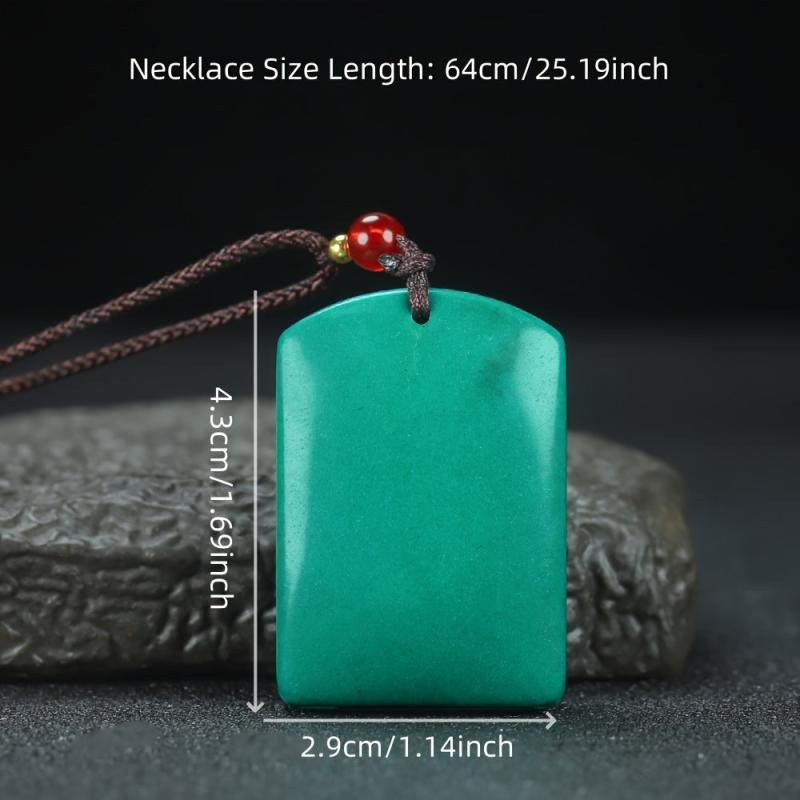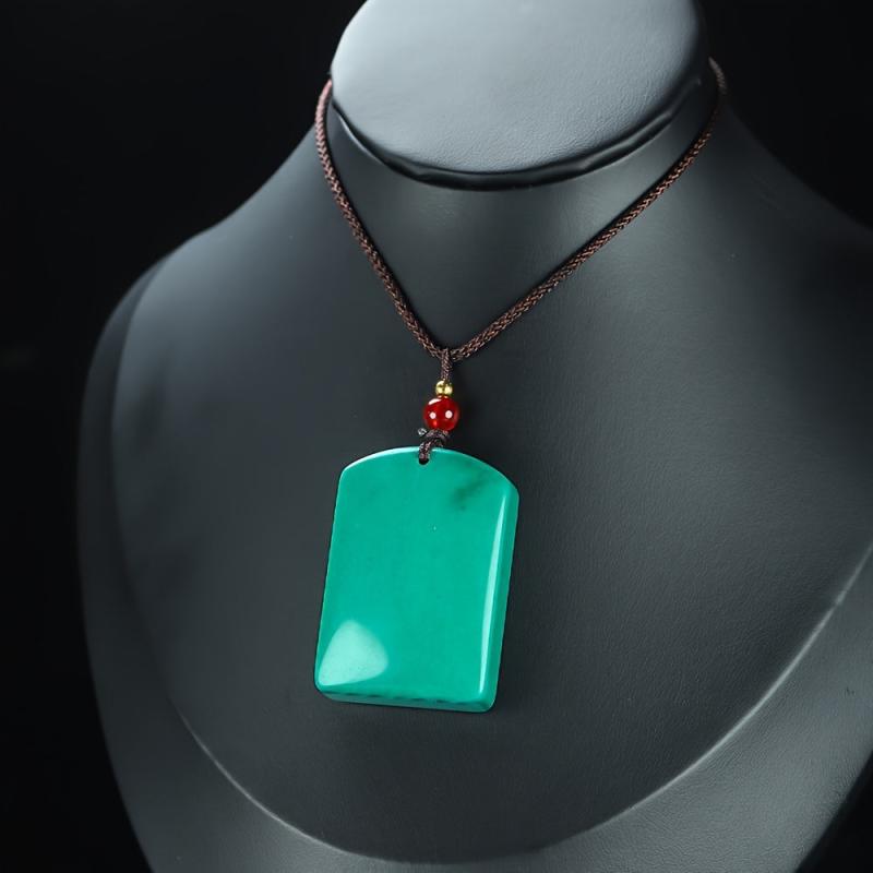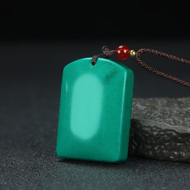 This turquoise pendant necklace is a unisex piece featuring a rectangular green stone charm with a red bead accent on a brown cord. Perfect gift for men and women.