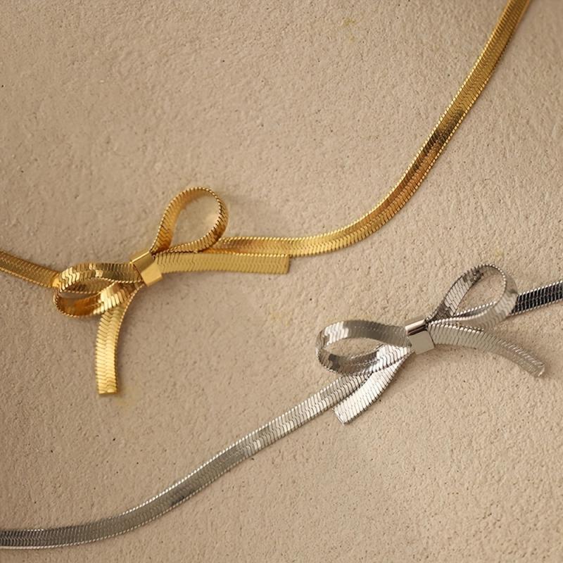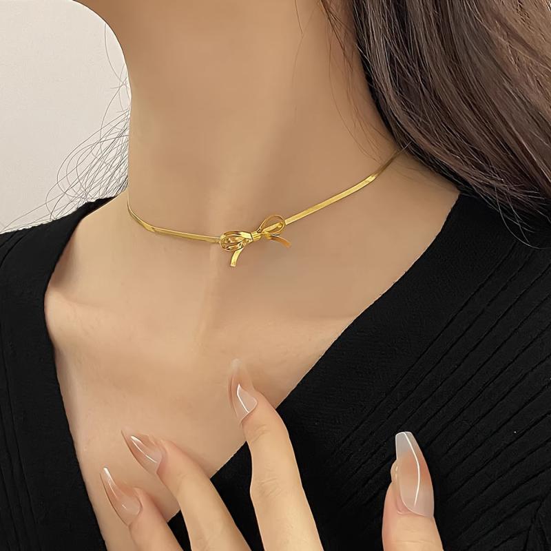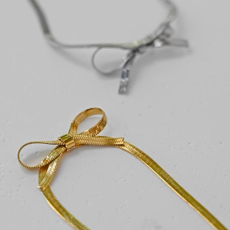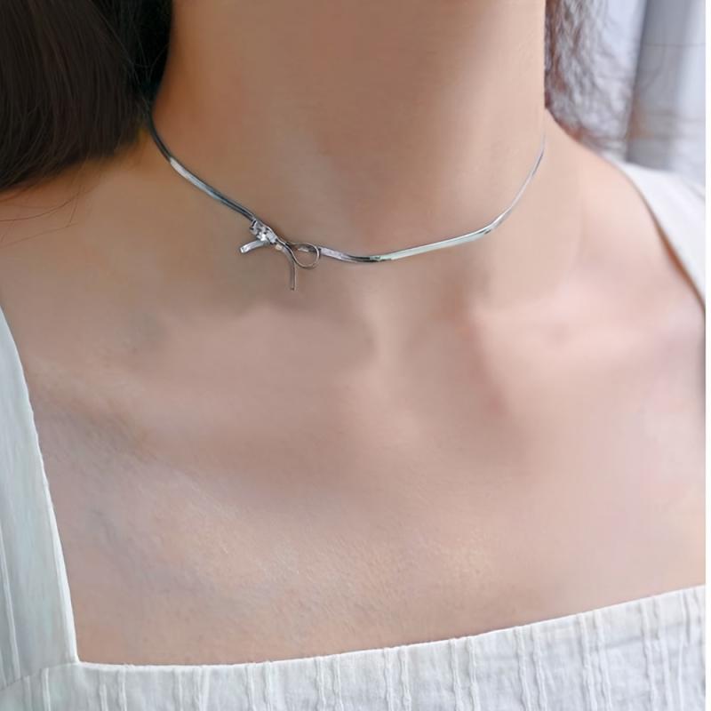 Elegant stainless steel choker necklace with bowknot design, adjustable length for daily wear & parties. Ideal Valentine's gift.
