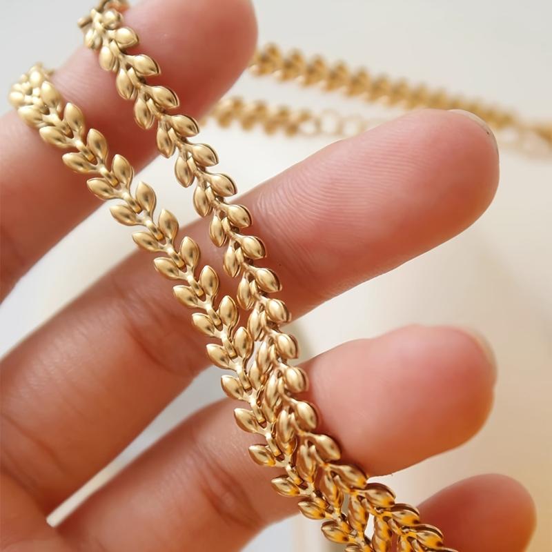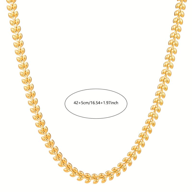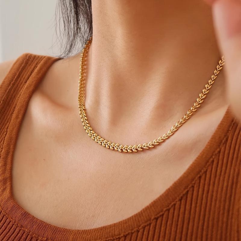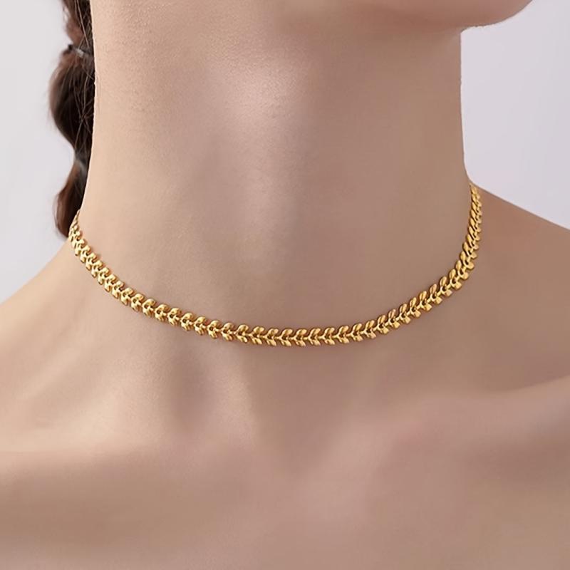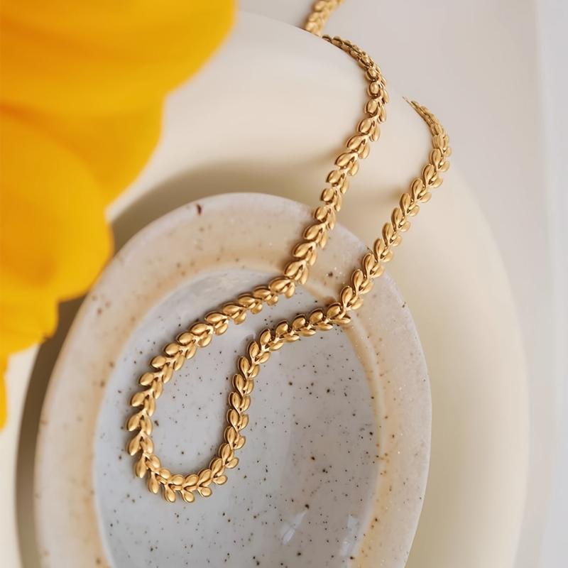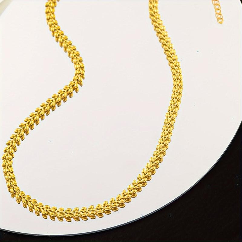 Elegant wheat ear design choker necklace crafted from stainless steel in a golden tone. Perfect for casual or resort attire, adding a touch of minimalist vacation style.