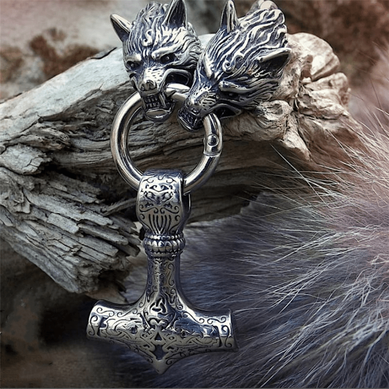 Nordic Viking Wolf Head Hammer Pendant Necklace - Men&