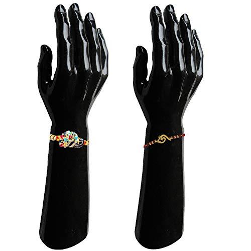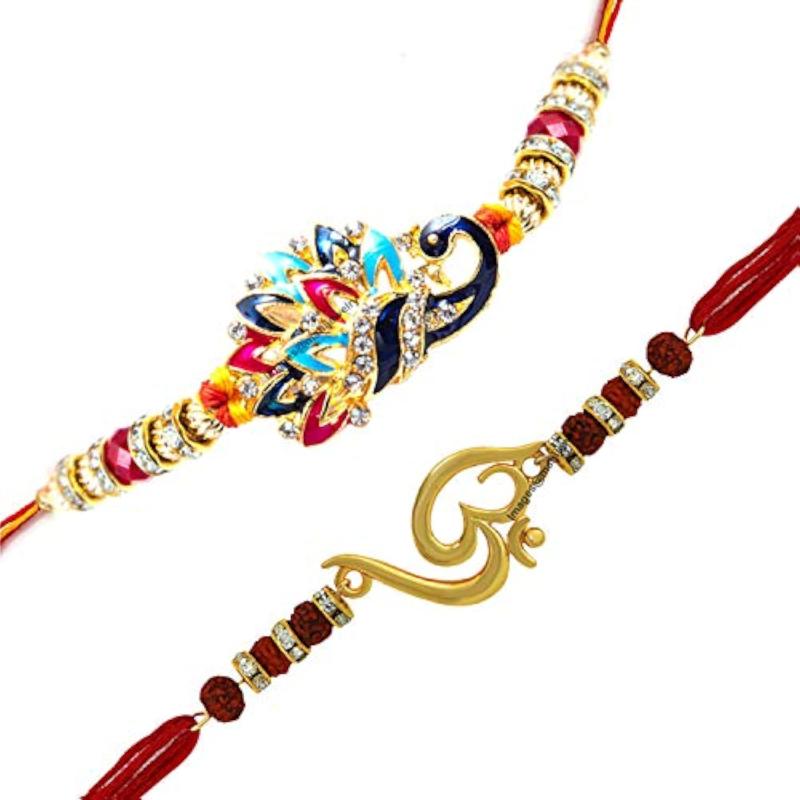 Celebrate Raksha Bandhan with this set of Om and Peacock design Bhaiya Bhabhi Rakhis featuring crystals and rudraksha beads.