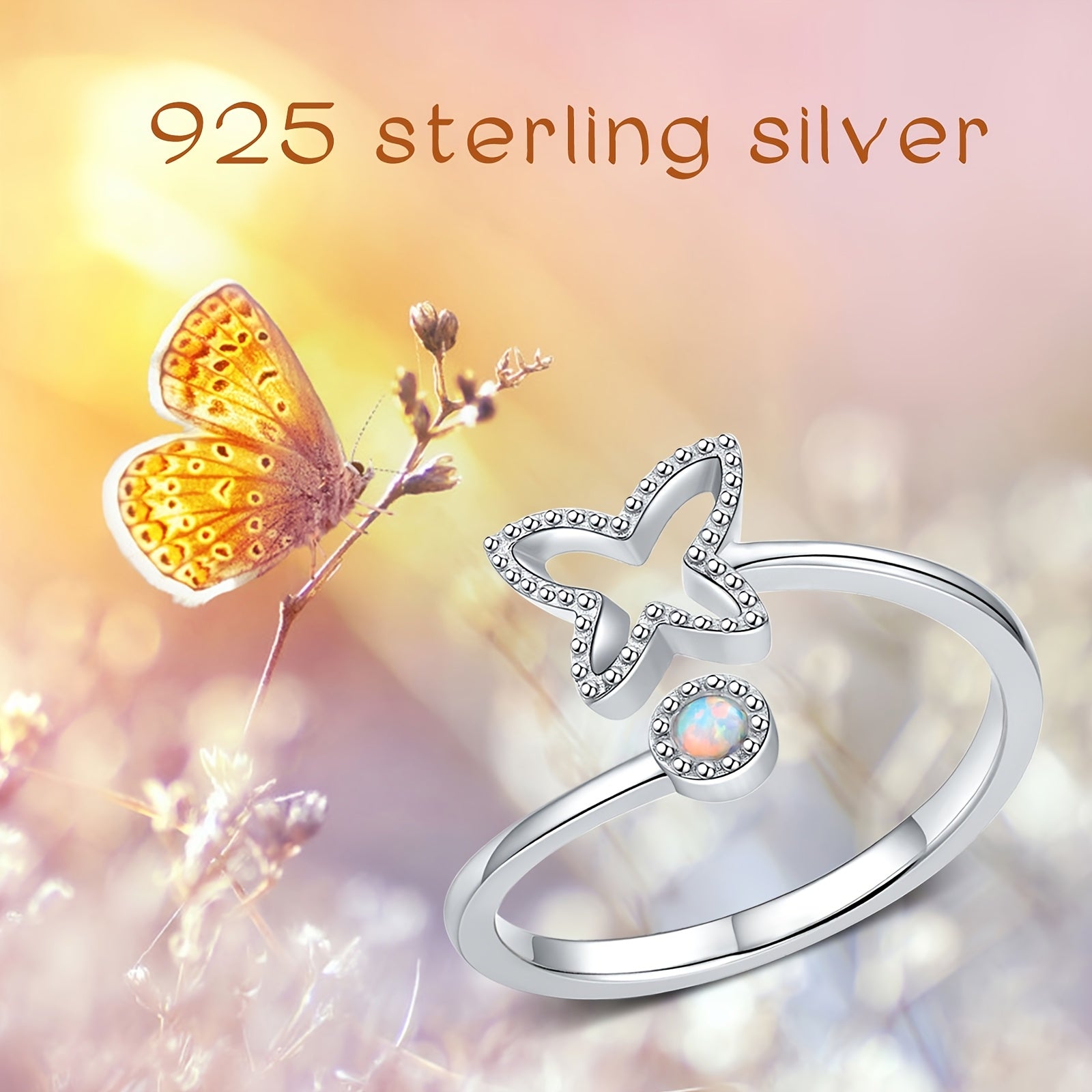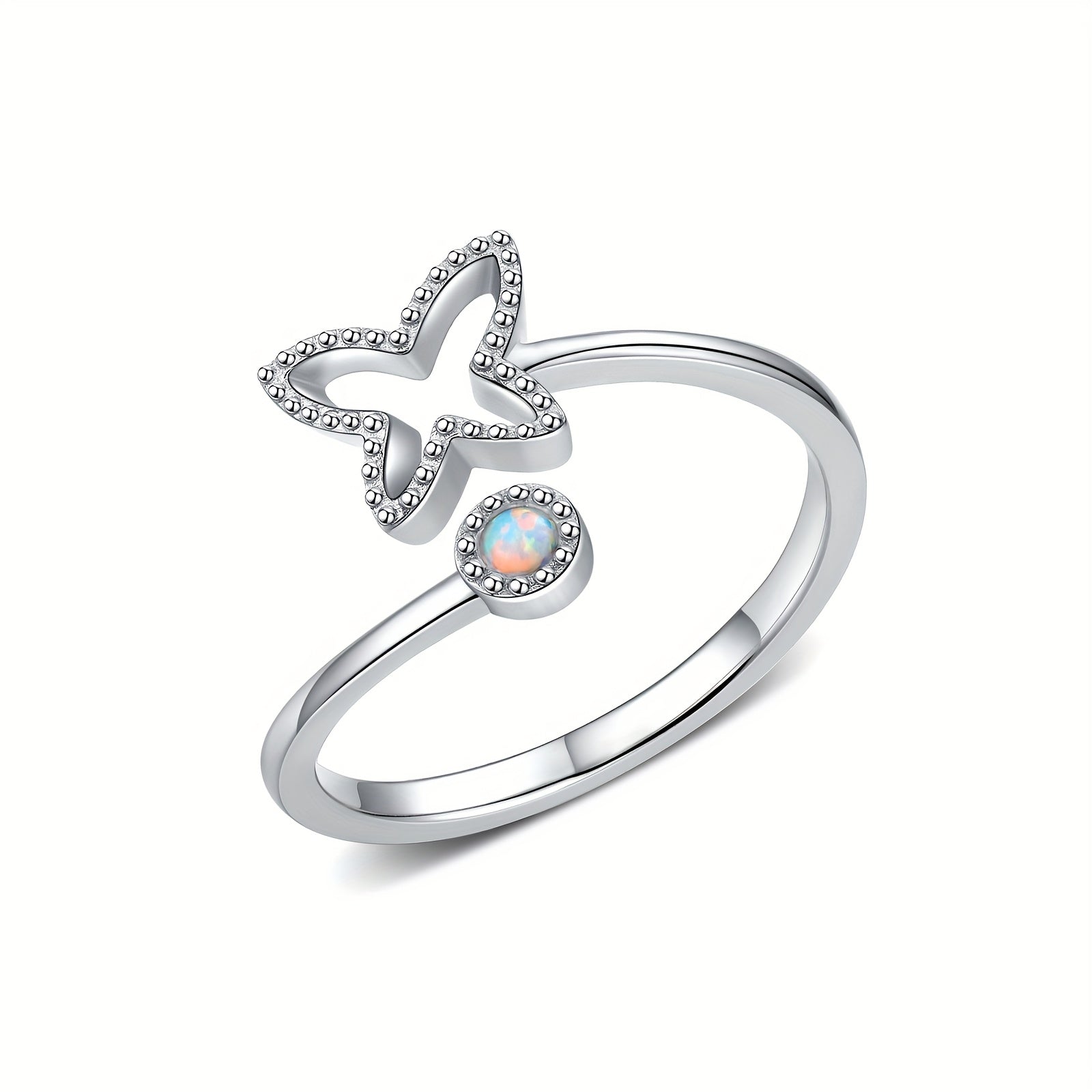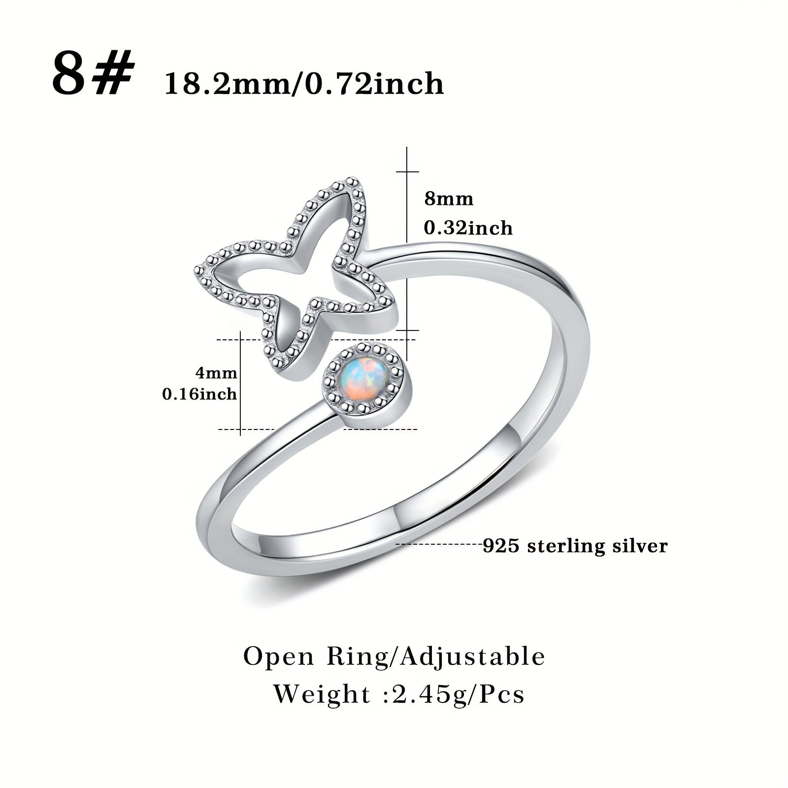 This butterfly open ring is crafted from 925 sterling silver and features a stunning artificial opal. The adjustable design ensures a perfect fit for any finger size.
