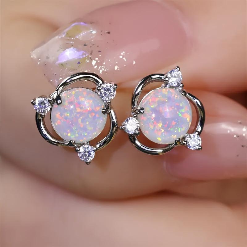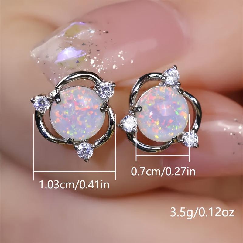 These round opal stud earrings feature three zirconia stones in a small flower design. Perfect for adding charm to your look on dates and special occasions.