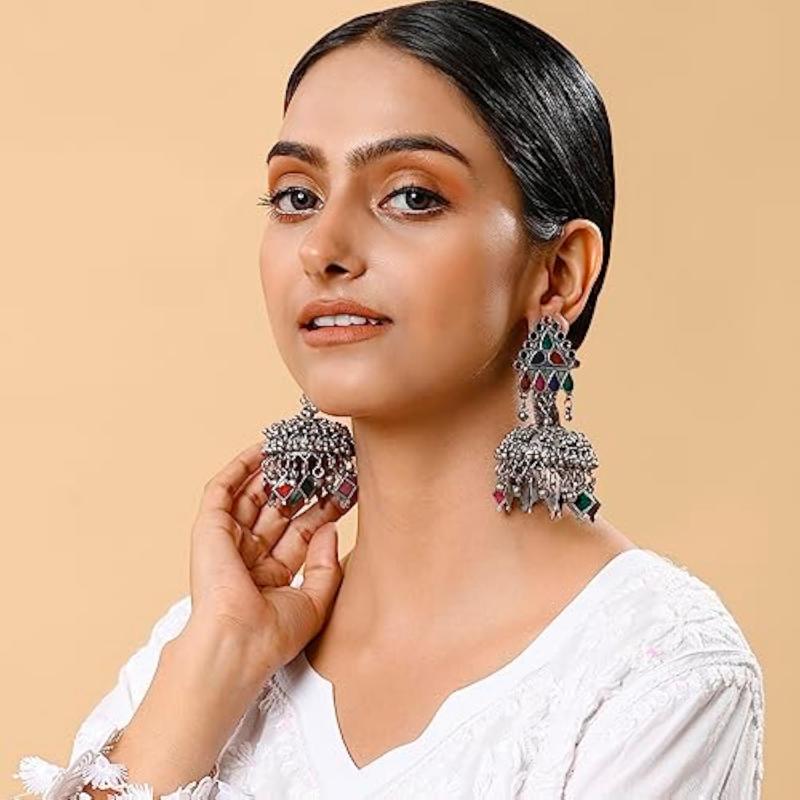 These traditional oxidised jhumka earrings are perfect for daily, party, or office wear. They are anti-tarnish, light weight, and stylish.