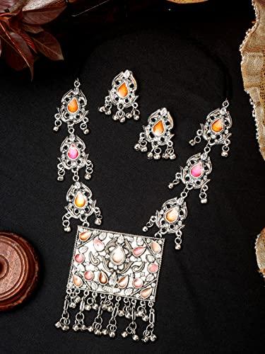 Enhance your ethnic look with this stylish Afghani tribal necklace set made of oxidised silver. The set includes a necklace and matching earrings.
