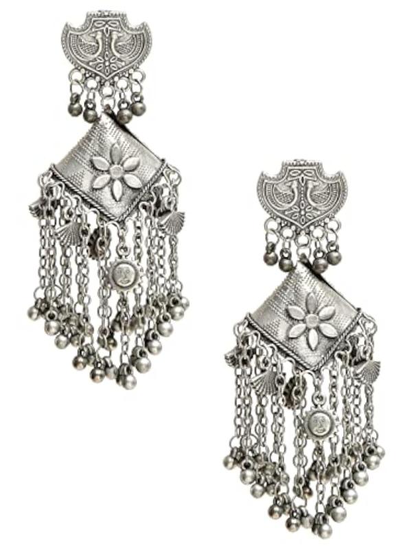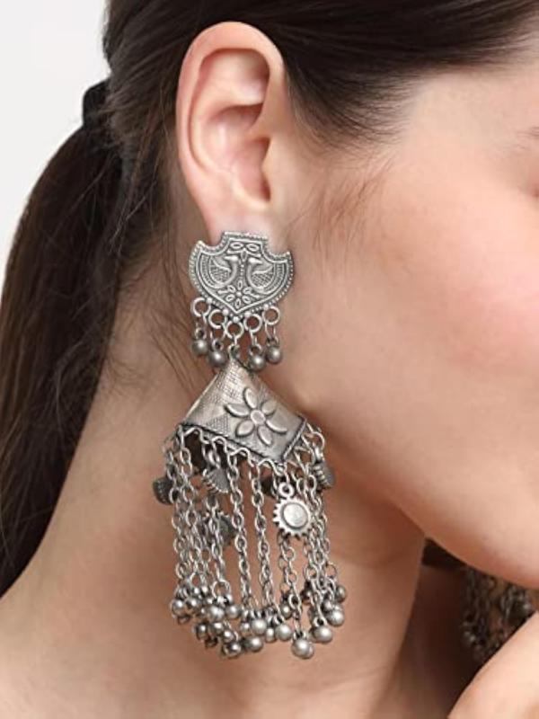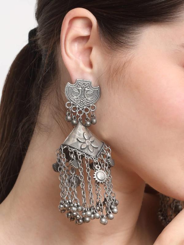 Elevate your style with these stunning oxidised silver jhumki earrings inspired by celebrity fashion. Perfect for adding a touch of elegance to any outfit.