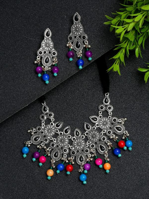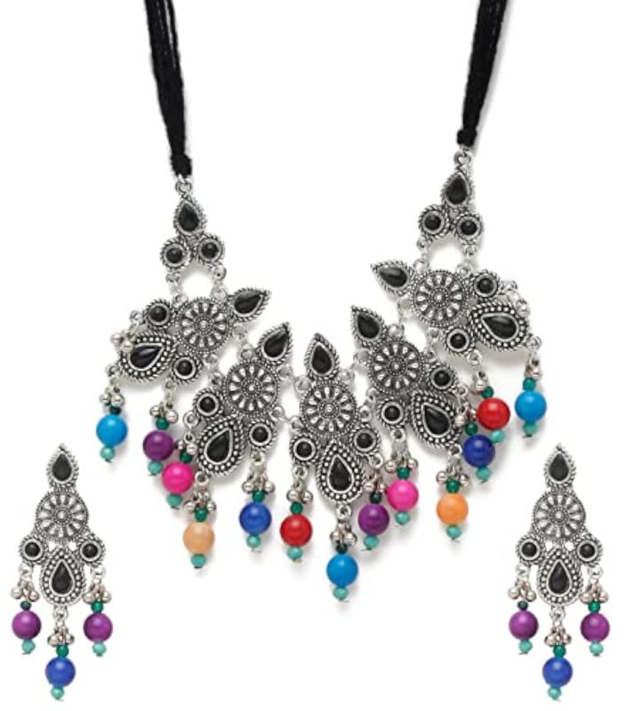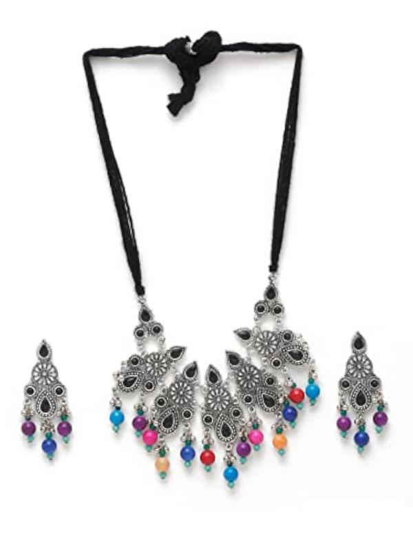 Enhance your look with this stunning oxidised silver necklace set, including matching earrings.