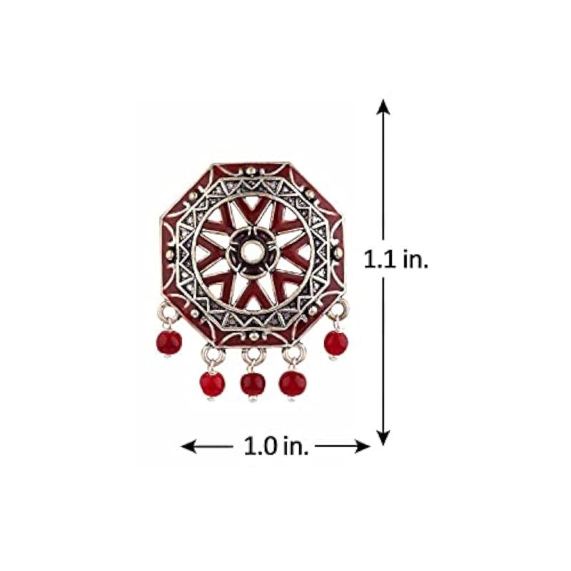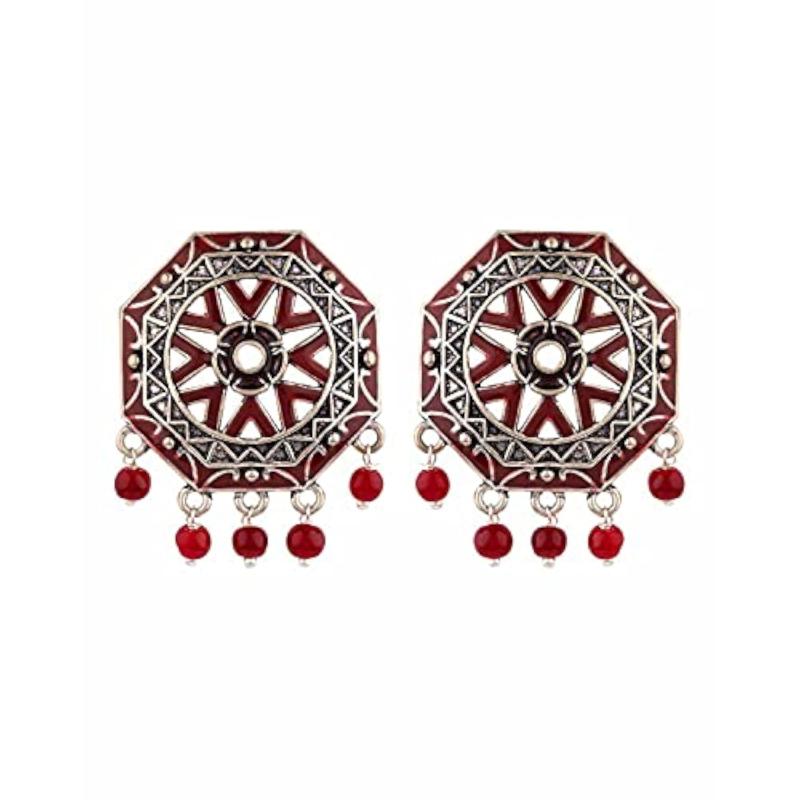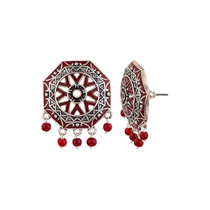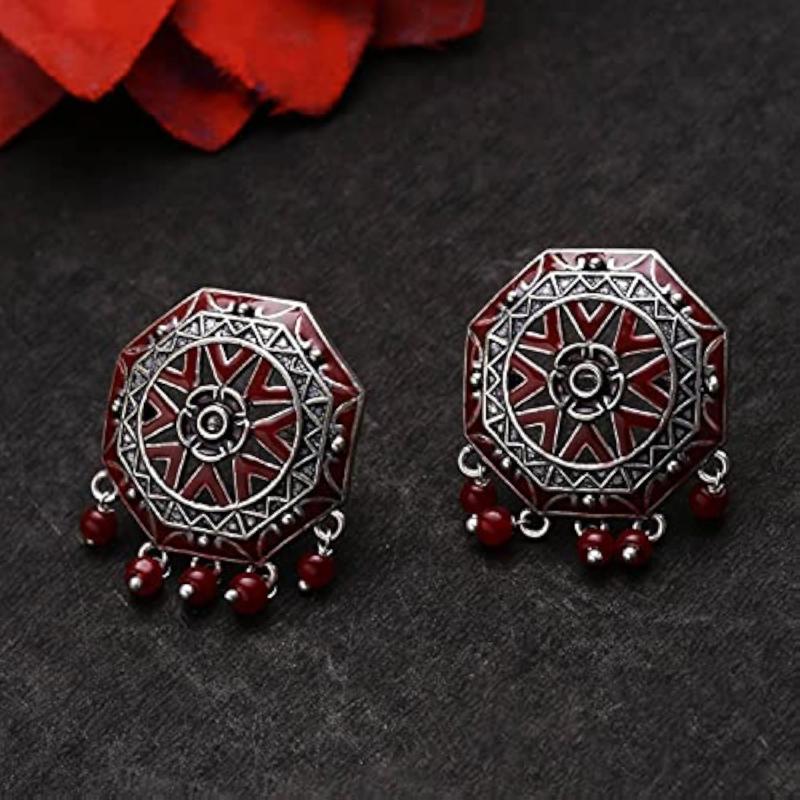 Add a touch of elegance to your outfit with these beautiful oxidised silver plated earrings featuring Rangabati maroon beads and disc design.
