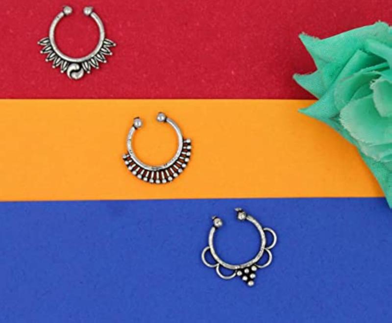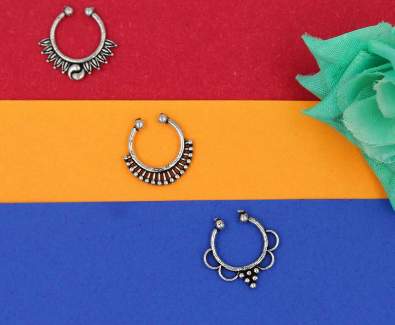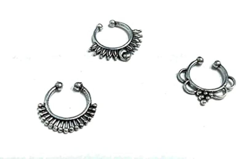Elegant set of oxidised silver-toned nosepins suitable for both men and women.