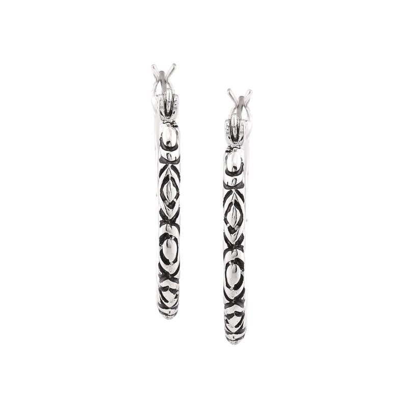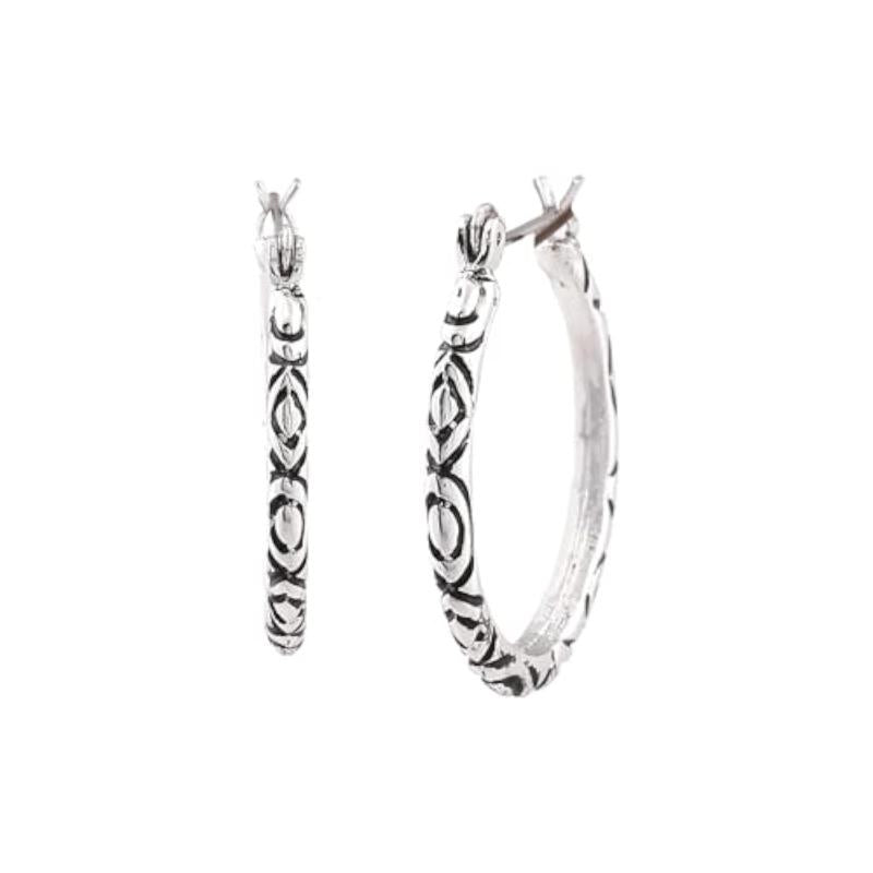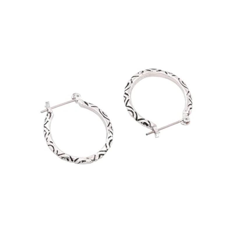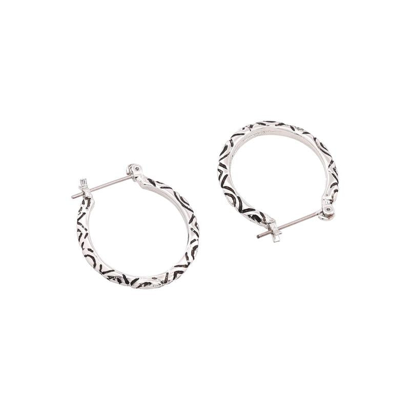 Add a touch of whimsical charm with these non-precious metal hoop earrings featuring an oxidized pattern design.