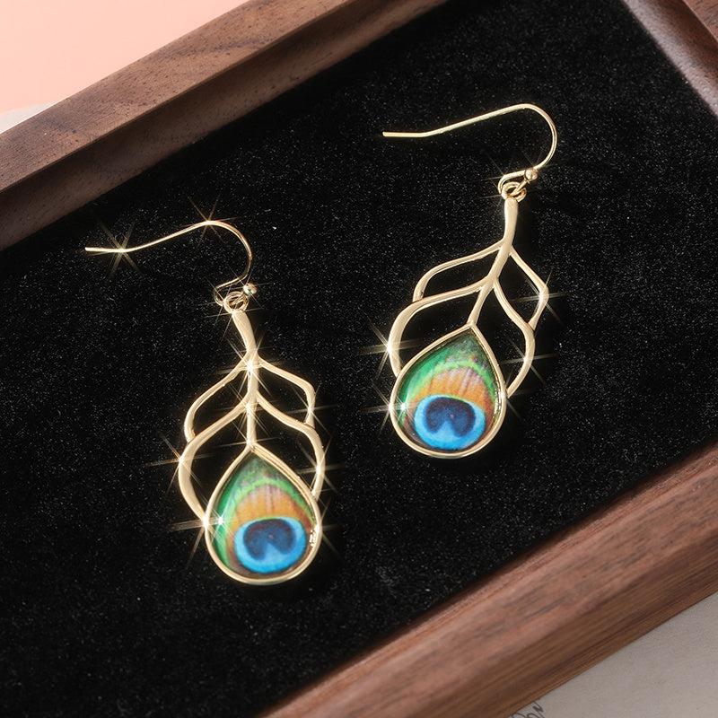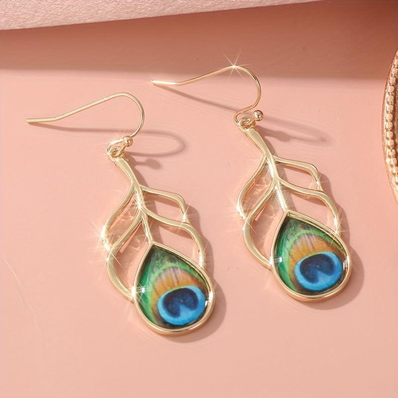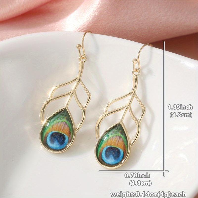 These elegant peacock feather earrings are perfect for everyday wear or special occasions. They feature a golden plated design with resin inlay and copper hooks. A unique addition to any jewelry collection.