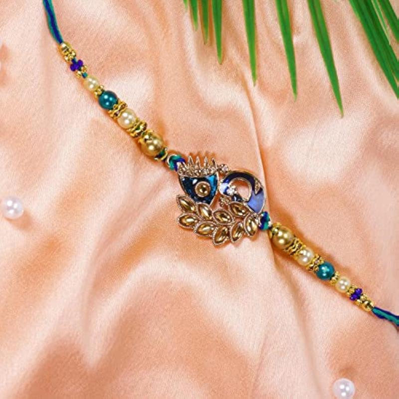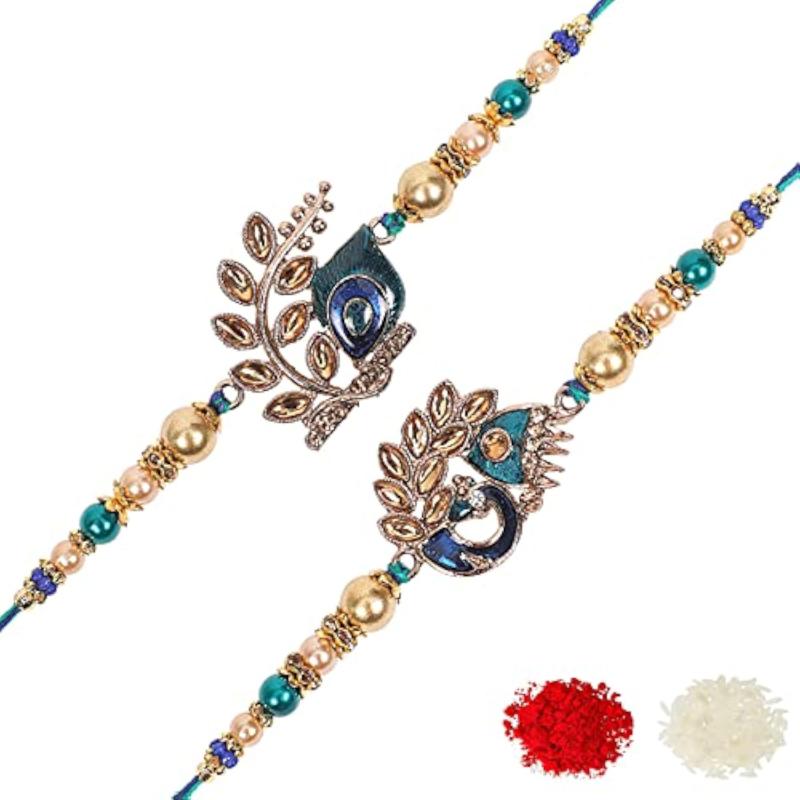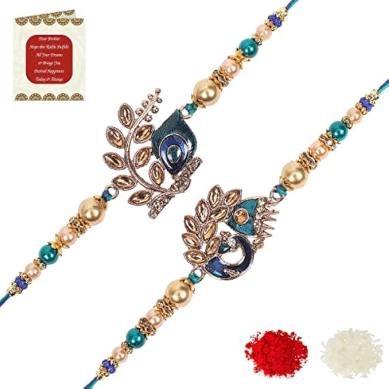 This beautiful set includes 2 stylish Peacock Feather & Royal Kundan Rakhis along with a heartfelt greeting card.