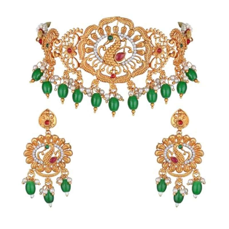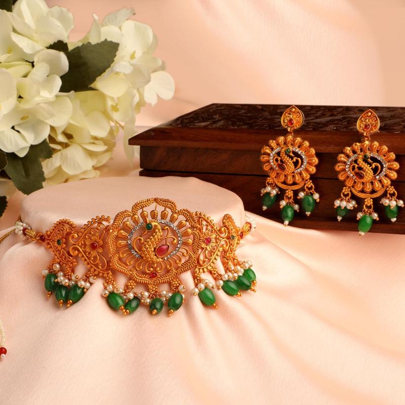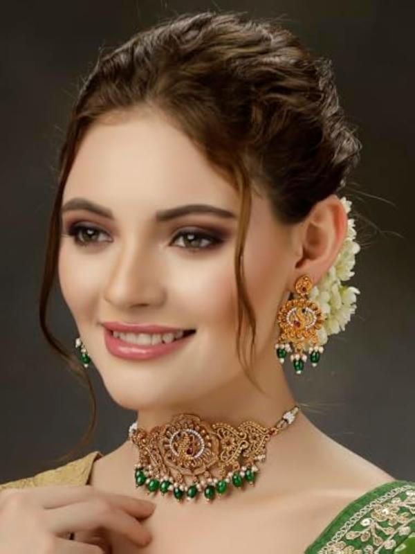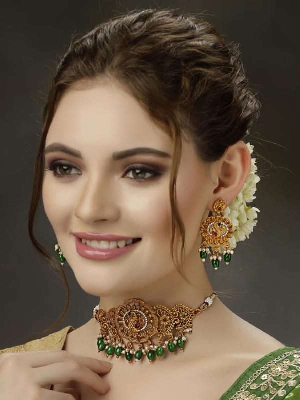 Enhance your ethnic look with this elegant pearl choker temple necklace set.