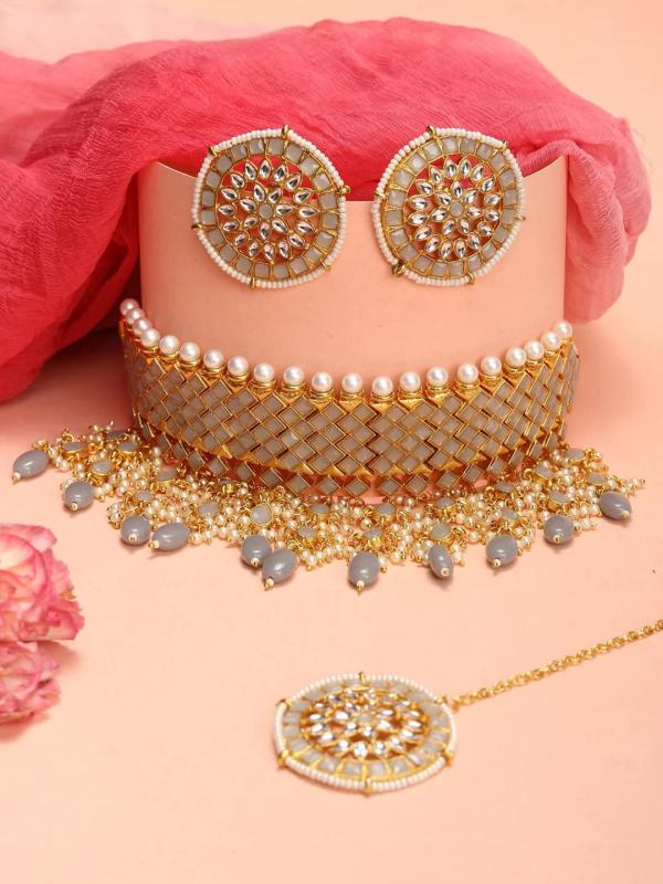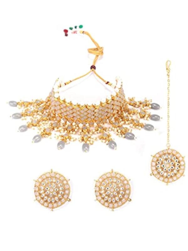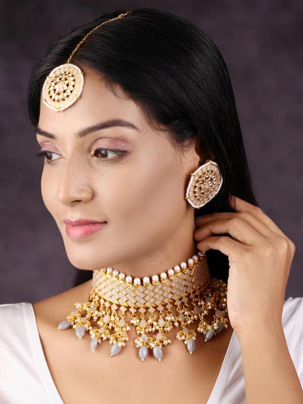 Elegant choker set with pearls, beads, kundan stones, and a matching maangtikka. Perfect for special occasions.
