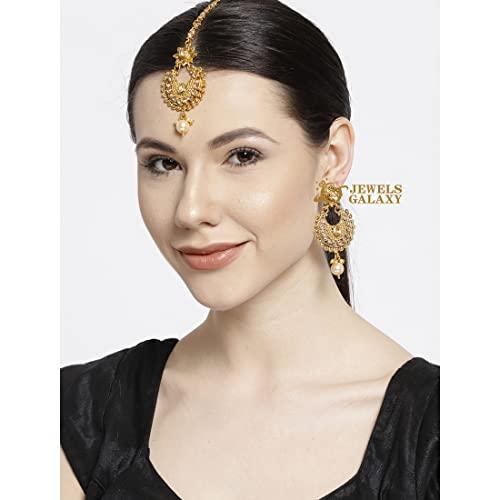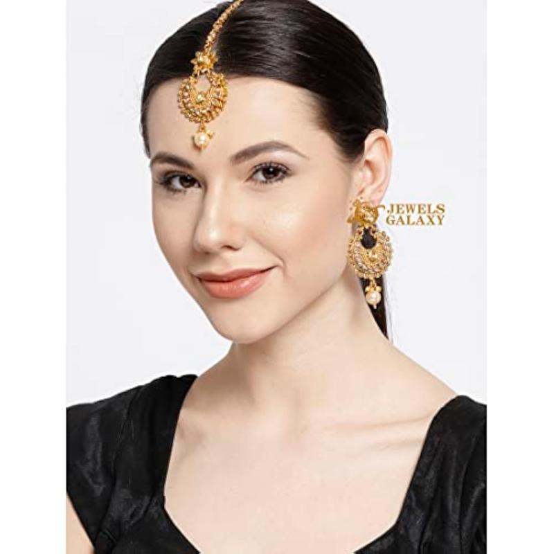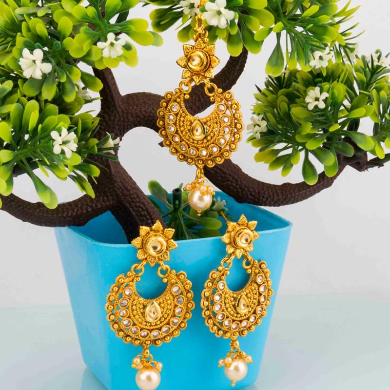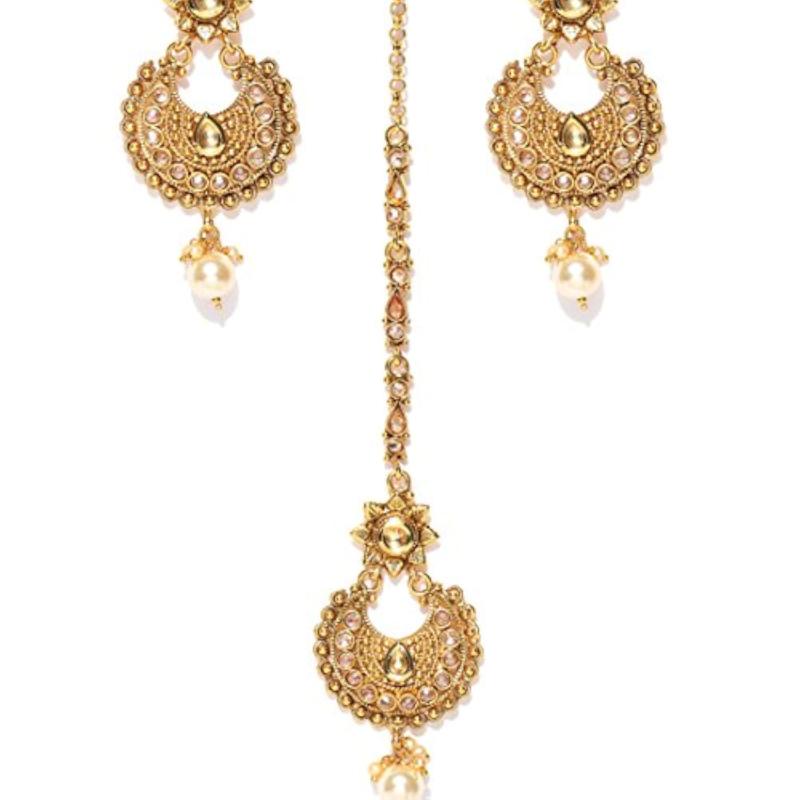Add a touch of grace to your traditional outfit with this elegant earrings and maang-tika set. Beautifully crafted with pearls drops and kundan studded design, this plated jewellery set is perfect for special occasions.