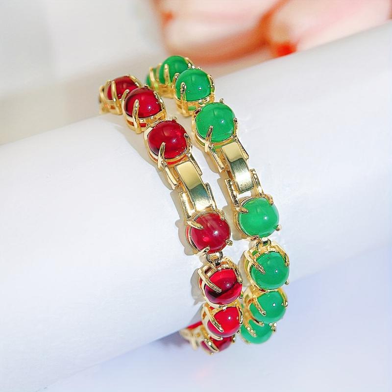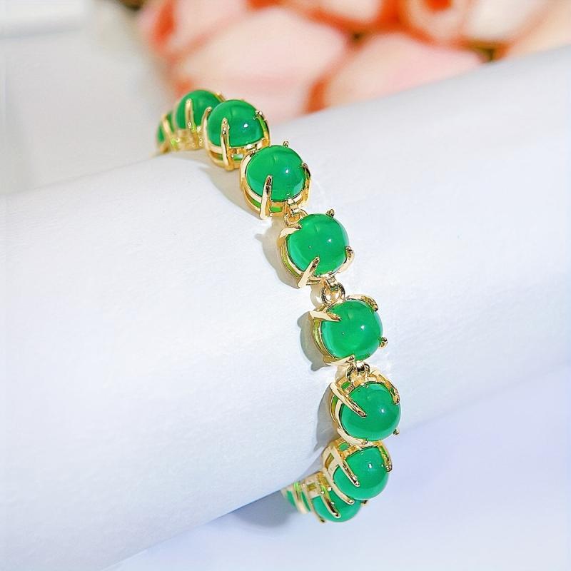 Elevate your style with this stunning bracelet featuring green round synthetic zirconia set in golden settings. Perfect for special occasions and parties.