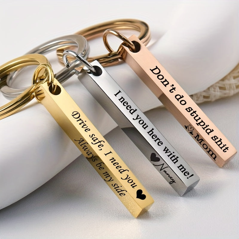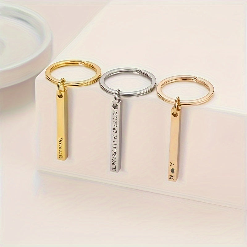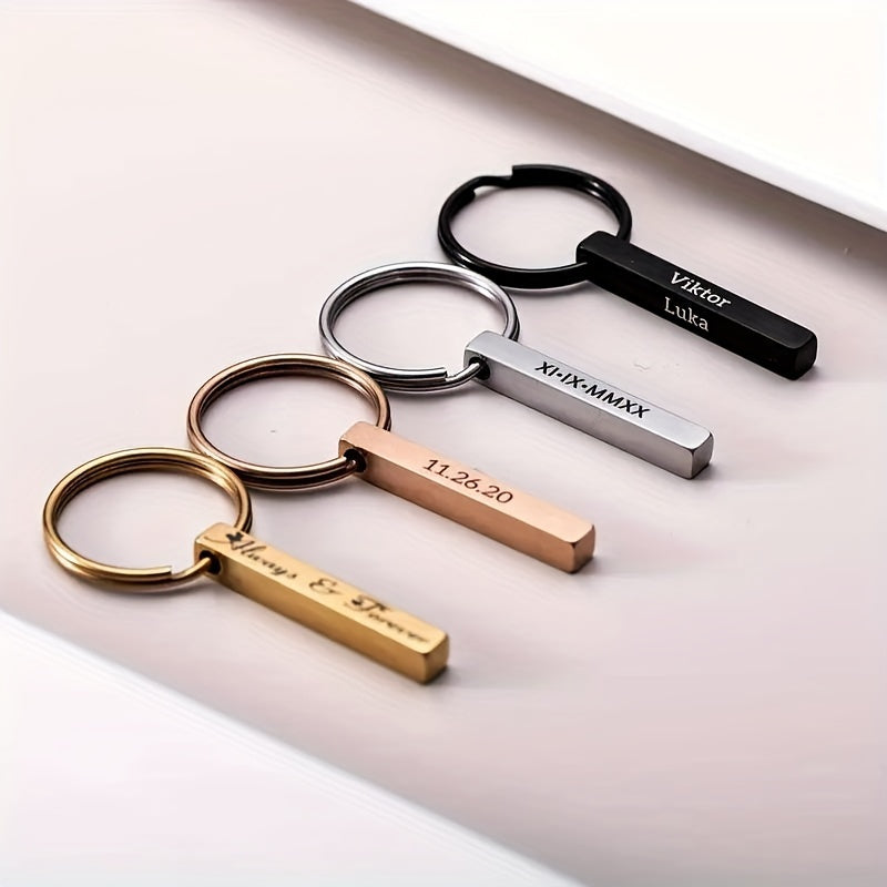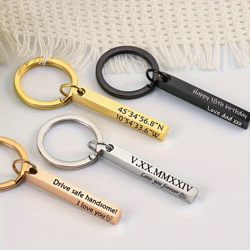 This rectangular bar keychain is made of durable stainless steel and can be custom engraved with four-sided coordinates. A perfect gift for men.