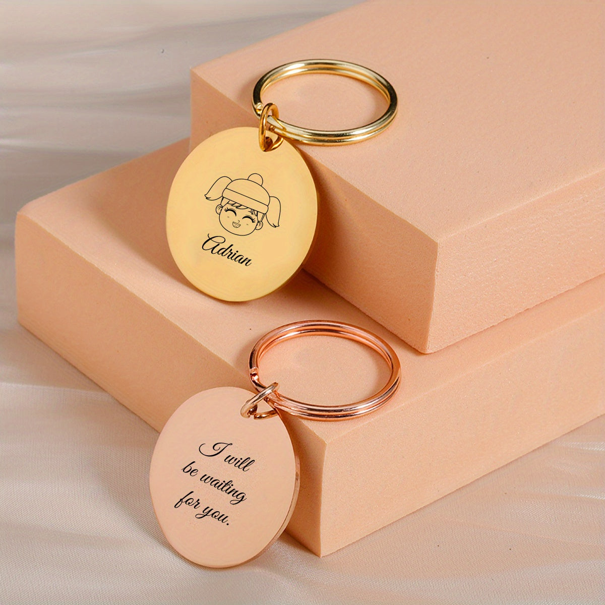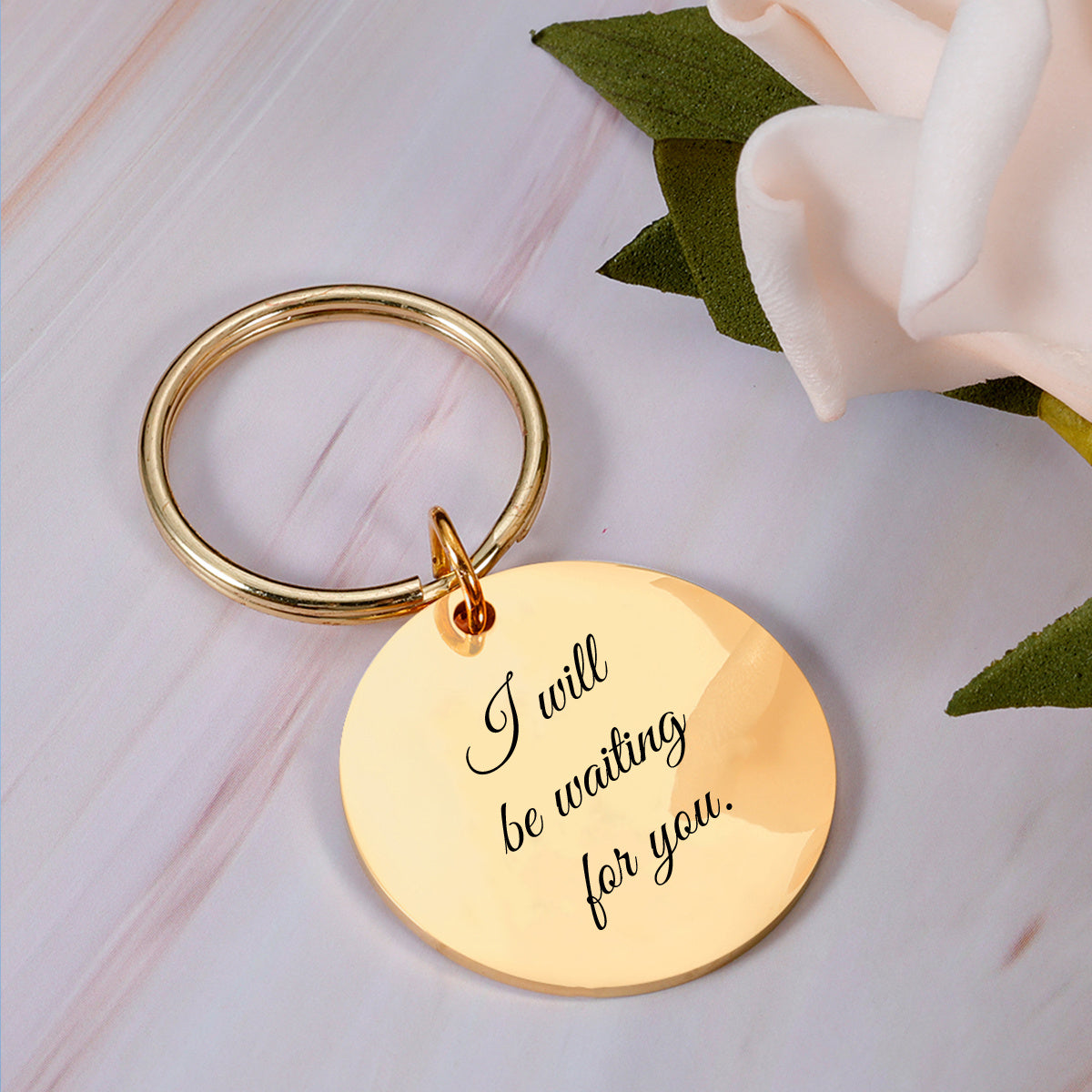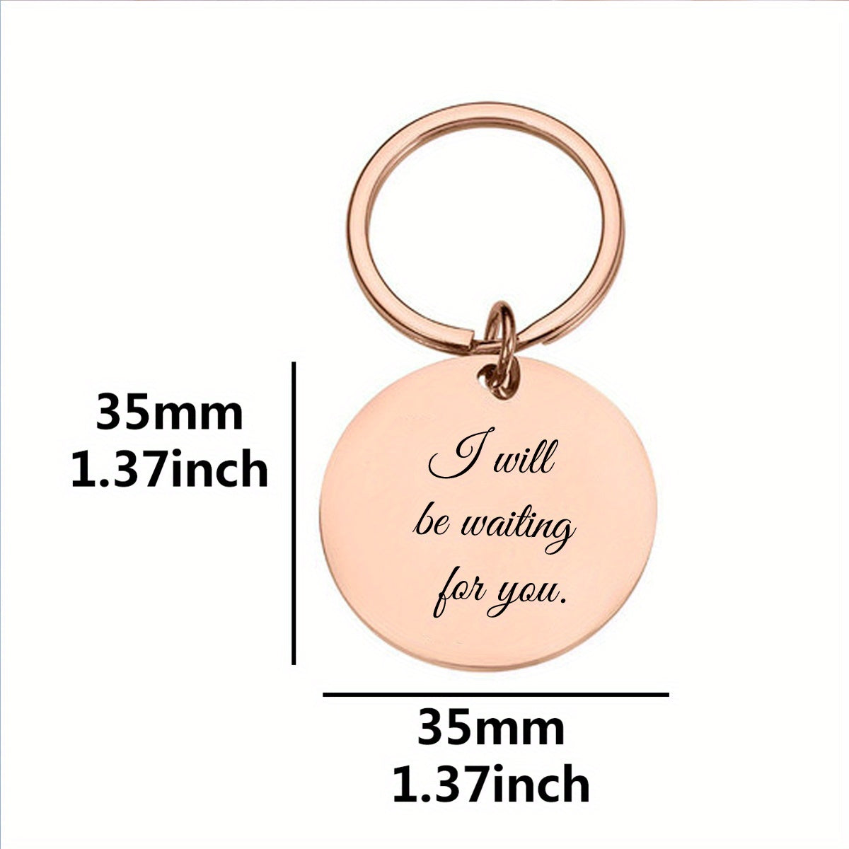Engraved metal keychain with the message 'I WILL BE WAITING for YOU'. Perfect Christening accessory and backpack embellishment for little girls.