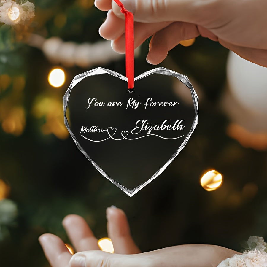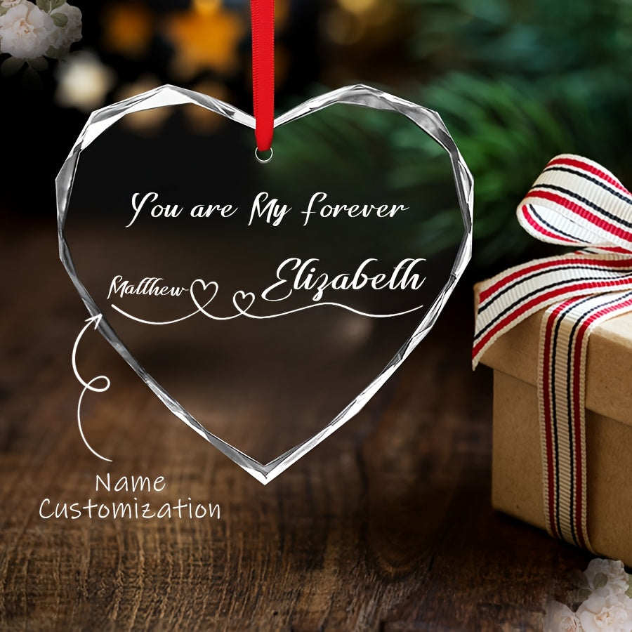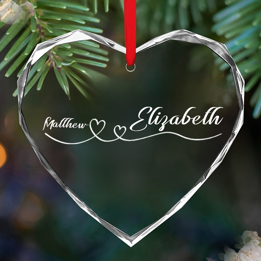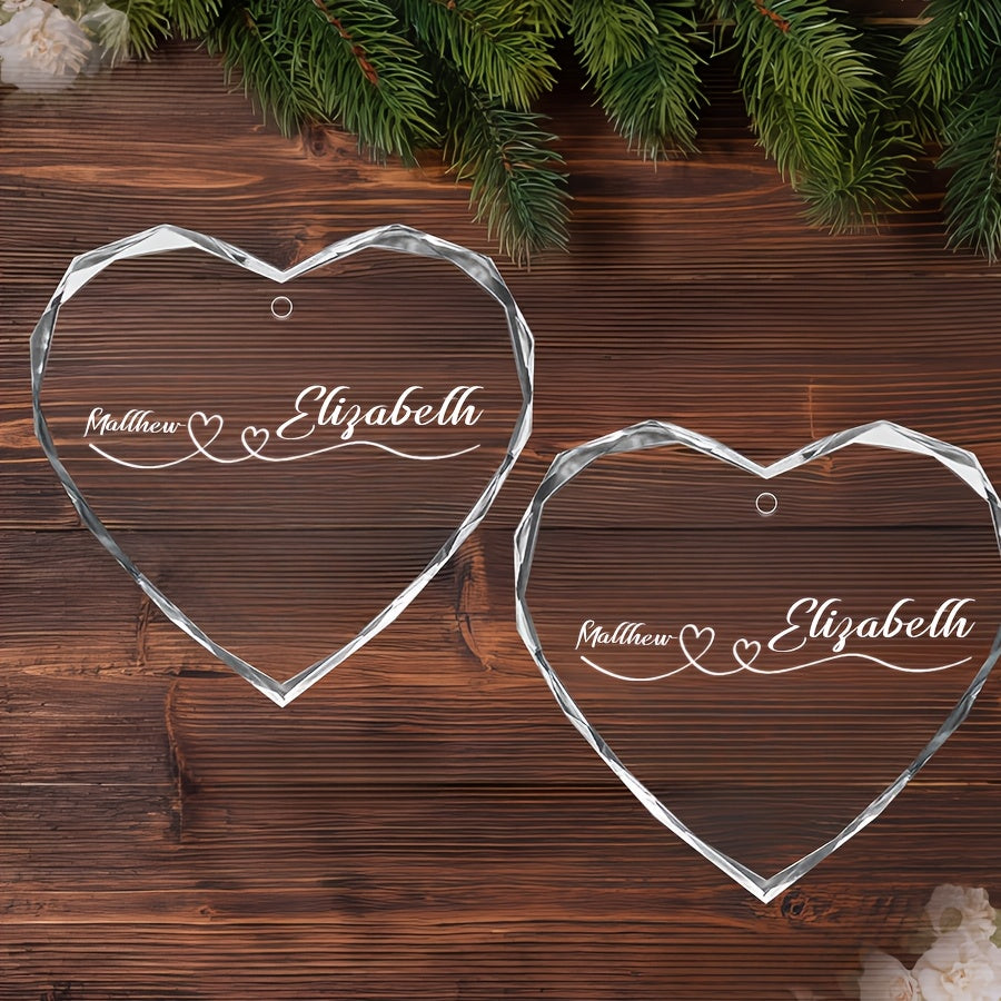 This beautiful crystal heart pendant is a perfect gift for couples. Customized with names, it adds a personal touch to home decor. The transparent glass design is elegant and timeless.