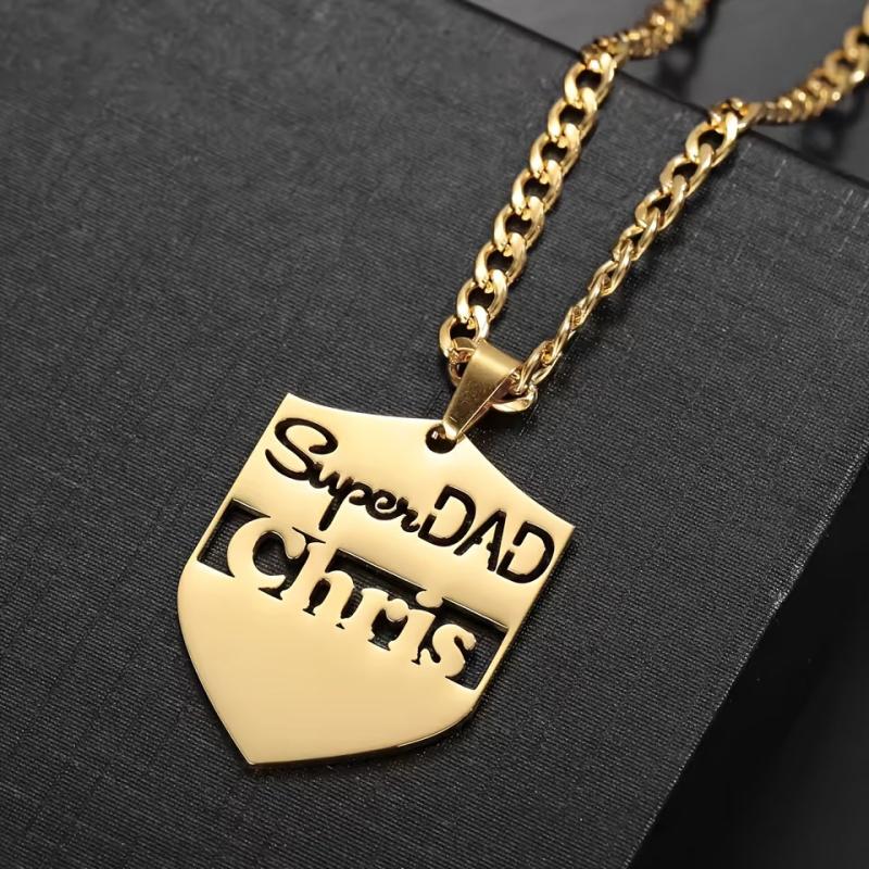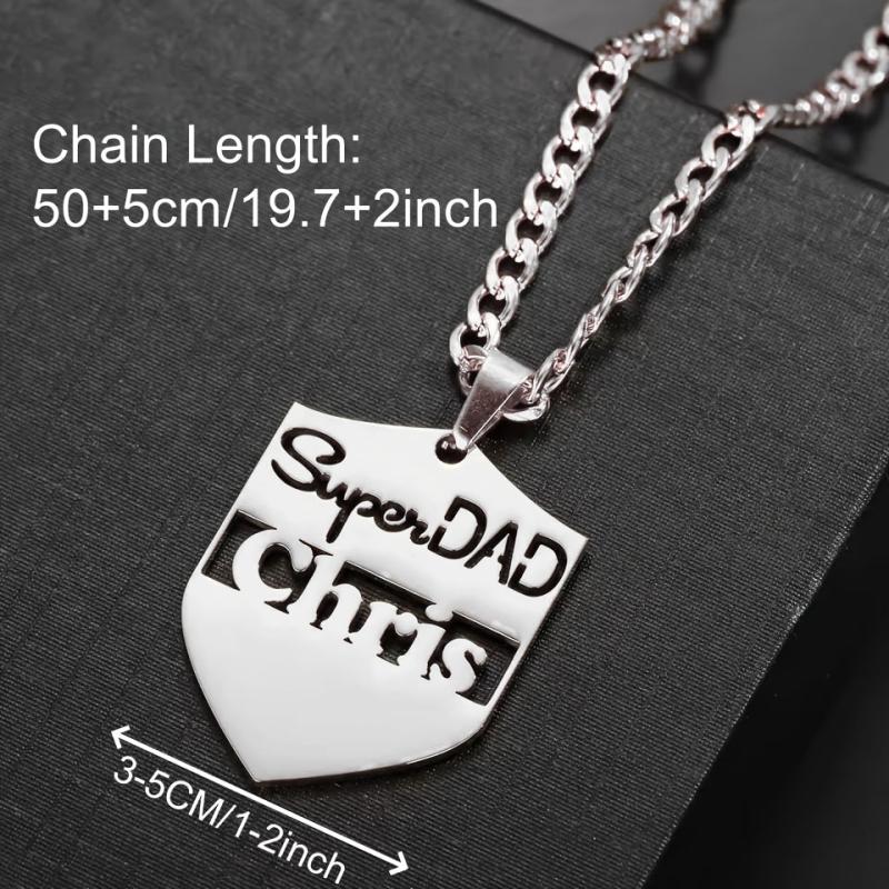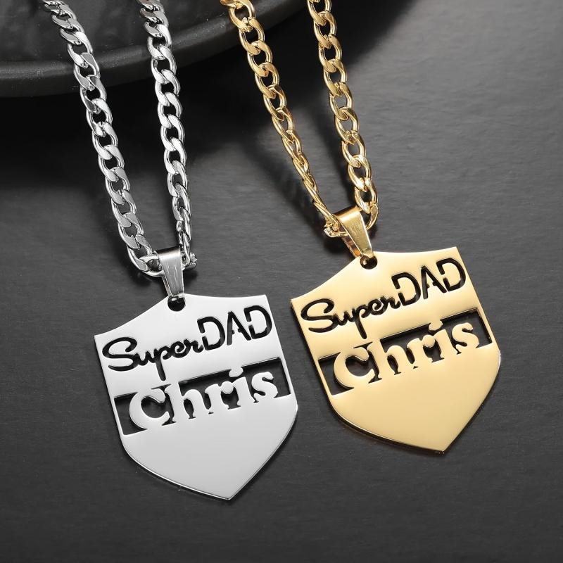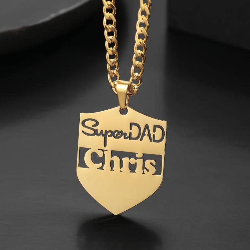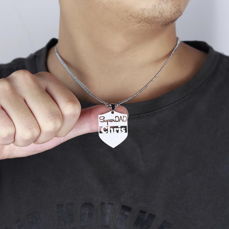This custom Cuban link chain necklace features a stainless steel shield pendant, making it an ideal gift for fathers. The stylish men's jewelry symbolizes family guardianship.