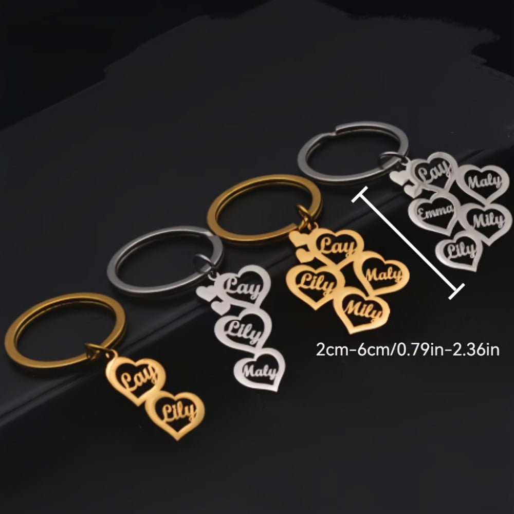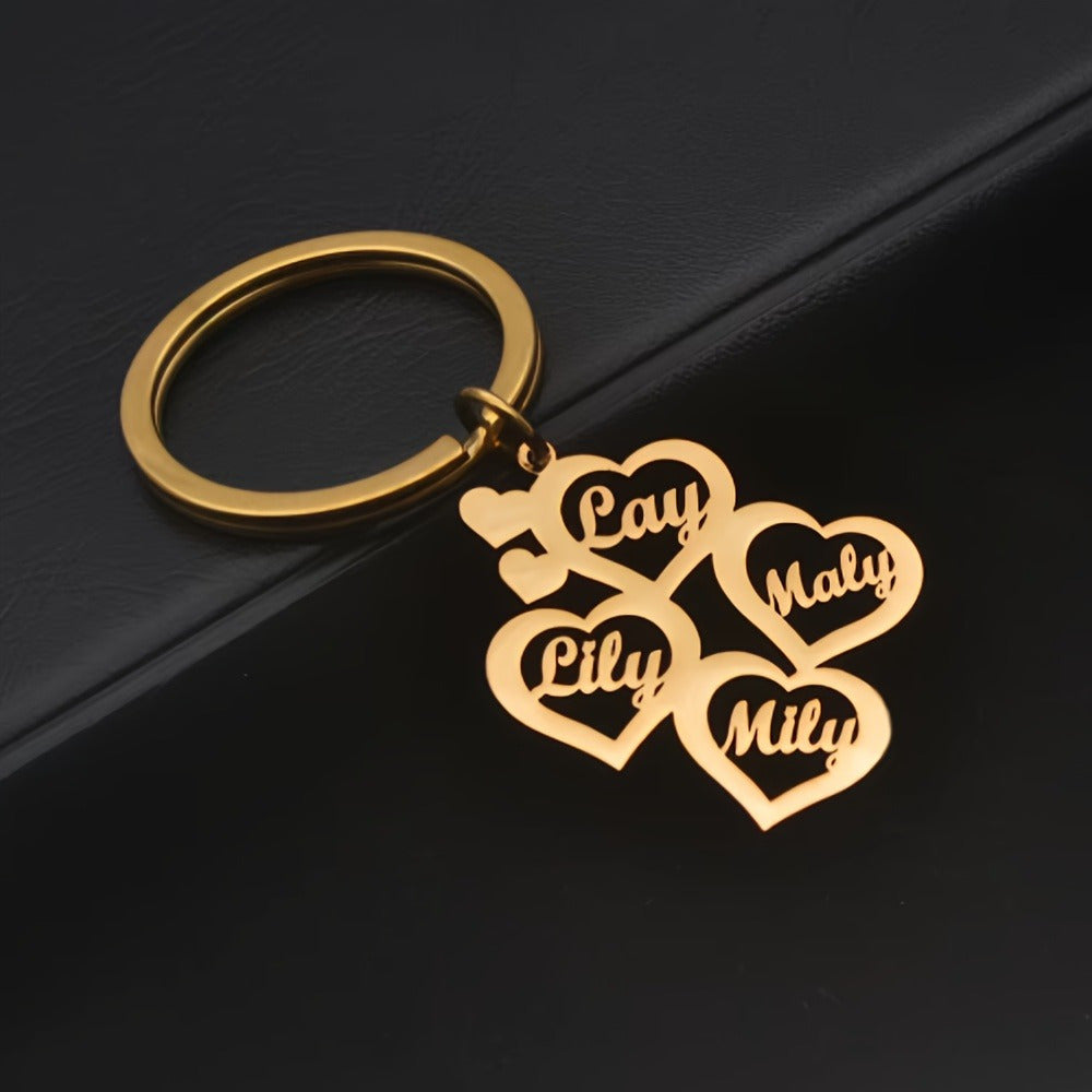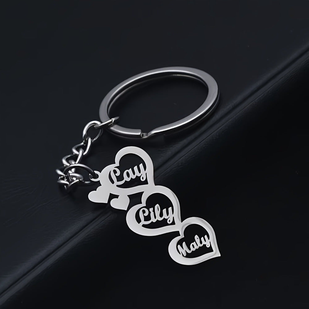 A customizable keychain with family surname and heart pendant. Made of stainless steel, this unique item features an alphabet theme.